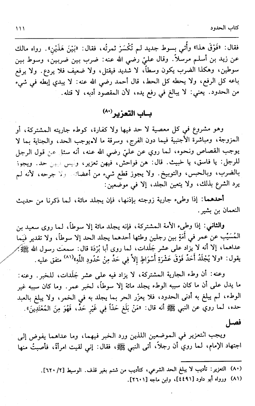 والثاني: إذا وطئ الأمة المشتركة، فإنه يجلد مائة إلا سوطاً؛ لما روى سعيد بن المسيب عن عمر في أمة بين رجلين وطئها أحدهما يجلد الحد إلا سوطاً، ولا تقدير فيما عداهما، إلا أنه لا يزاد على عشر جلدات؛ لما روى أبو بردة قال: «سمعت رسول الله - صَلَّى اللَّهُ عَلَيْهِ وَسَلَّمَ - يقول: ولا يجلد أحد فوق عشرة أسواط إلا في حد من حدود الله» متفق عليه.