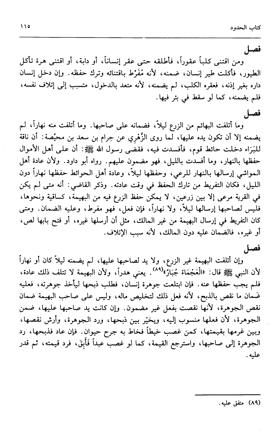 وما أتلفت البهائم من الزرع ليلاً، فضمانه على صاحبها. وما أتلفت منه نهاراً، لم يضمنه إلا أن تكون يده عليها؛ لما روى الزهري عن حرام بن سعد بن محيصة: «أن ناقة للبراء دخلت حائط قوم، فأفسدت فيه، فقضى رسول الله - صَلَّى اللَّهُ عَلَيْهِ وَسَلَّمَ -: أن على أهل الأموال حفظها بالنهار، وما أفسدت بالليل، فهو مضمون عليهم.» رواه أبو داود؛ ولأن عادة أهل المواشي إرسالها بالنهار للرعي، وحفظها ليلاً، وعادة أهل الحوائط حفظها نهاراً دون الليل، فكان التفريط من تارك الحفظ في وقت عادته. وذكر القاضي: أنه متى لم يكن في القرية مرعى إلا بين زرعين، لا يمكن حفظ الزرع فيه من البهيمة، كساقية ونحوها، فليس لصاحبها إرسالها ليلاً، ولا نهاراً، فإن فعل، فهو مفرط، وعليه الضمان. ومتى كان التفريط في إرسال البهيمة من غير المالك، مثل أن أرسلها غيره، أو فتح بابها لص، أو غيره، فالضمان عليه دون المالك؛ لأنه سبب الإتلاف.