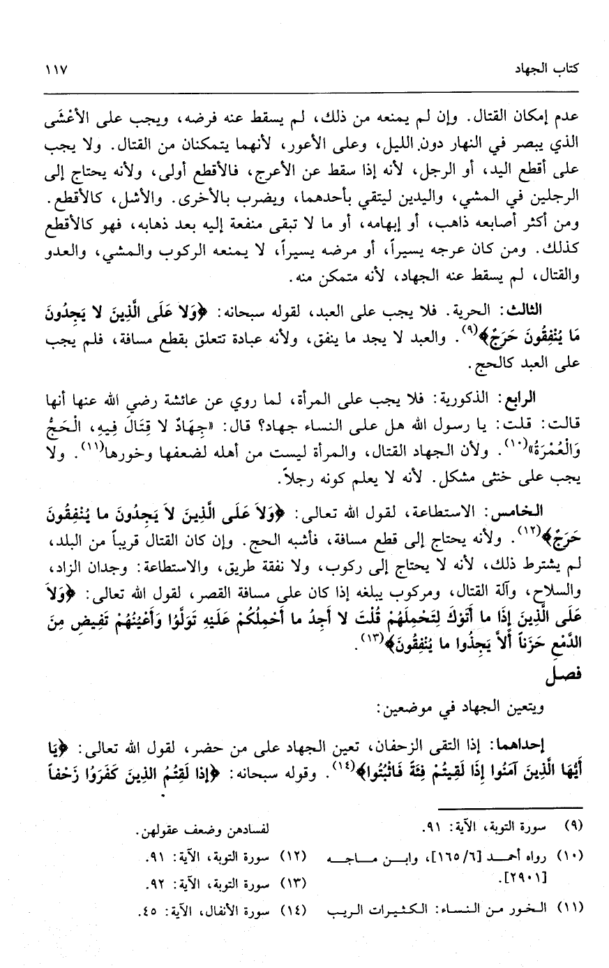 الخامس: الاستطاعة؛ لقول الله تعالى: {وَلا عَلَى الَّذِينَ لا يَجِدُونَ مَا يُنْفِقُونَ حَرَجٌ} [التوبة: 91] ؛ ولأنه يحتاج إلى قطع مسافة، فأشبه الحج. وإن كان القتال قريباً من البلد، لم يشترط ذلك؛ لأنه لا يحتاج إلى ركوب، ولا نفقة طريق، والاستطاعة: وجدان الزاد، والسلاح، وآلة القتال، ومركوب يبلغه إذا كان على مسافة القصر؛ لقول الله تعالى: {وَلا عَلَى الَّذِينَ إِذَا مَا أَتَوْكَ لِتَحْمِلَهُمْ قُلْتَ لا أَجِدُ مَا أَحْمِلُكُمْ عَلَيْهِ تَوَلَّوْا وَأَعْيُنُهُمْ تَفِيضُ مِنَ الدَّمْعِ حَزَنًا أَلا يَجِدُوا مَا يُنْفِقُونَ} [التوبة: 92] .