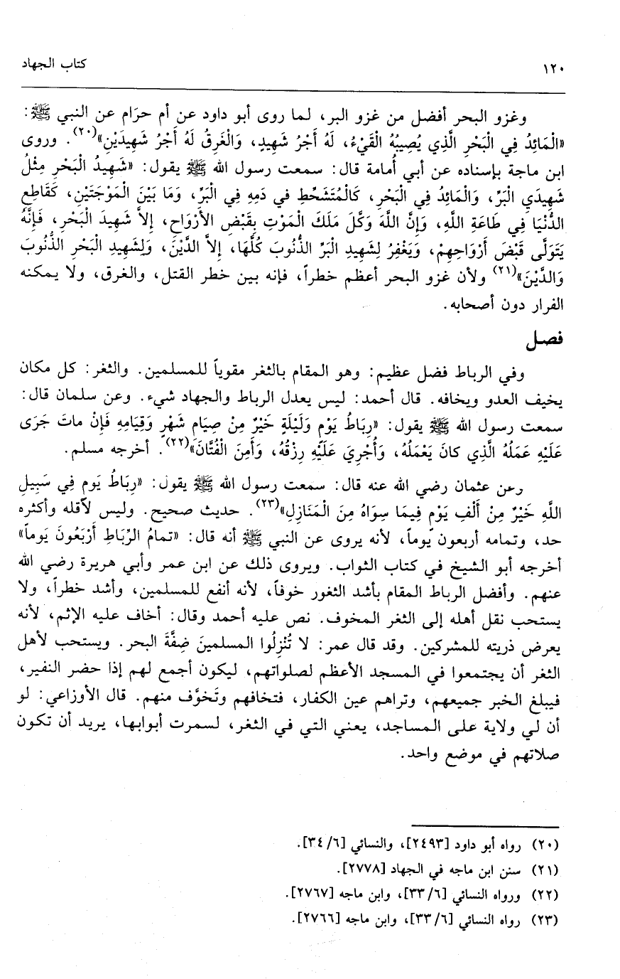 وعن عثمان - رَضِيَ اللَّهُ عَنْهُ - قال: سمعت رسول الله - صَلَّى اللَّهُ عَلَيْهِ وَسَلَّمَ - يقول: «رباط يوم في سبيل الله خير من ألف يوم فيما سواه من المنازل» . حديث صحيح. وليس لأقله وأكثره حد، وتمامه أربعون يوماً؛ لأنه يروى عن النبي - صَلَّى اللَّهُ عَلَيْهِ وَسَلَّمَ - أنه قال: «تمام الرباط أربعون يوماً» أخرجه أبو الشيخ في كتاب الثواب. ويروى ذلك عن ابن عمر وأبي هريرة - رَضِيَ اللَّهُ عَنْهُمْ -. وأفضل الرباط المقام بأشد الثغور خوفاً؛ لأنه أنفع للمسلمين، وأشد خطراً، ولا يستحب نقل أهله إلى الثغر المخوف. نص عليه أحمد وقال: أخاف عليه الإثم؛ لأنه يعرض ذريته للمشركين. وقد قال عمر: لا تنزلوا المسلمين ضفة البحر. ويستحب لأهل الثغر أن يجتمعوا في المسجد الأعظم لصلواتهم، ليكون أجمع لهم إذا حضر النفير. فيبلغ الخبر جميعهم، وتراهم عين الكفار، فتخافهم وتخوف منهم. قال الأوزاعي: لو أن لي ولاية على المساجد، يعني التي في الثغر، لسمرت أبوابها، يريد أن تكون صلاتهم في موضع واحد.