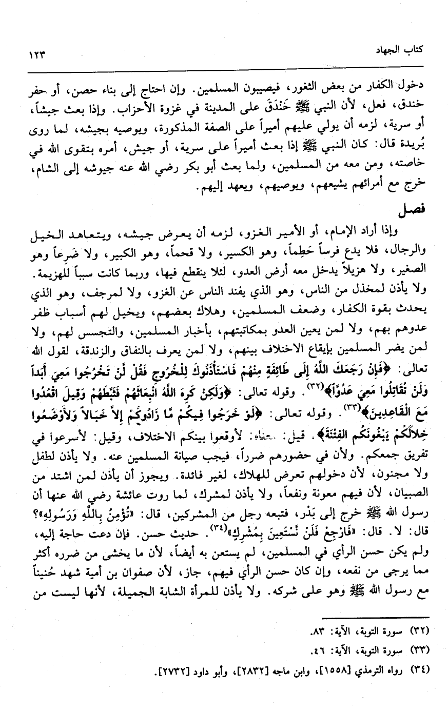 دخول الكفار من بعض الثغور، فيصيبون المسلمين. وإن احتاج إلى بناء حصن، أو حفر خندق، فعل؛ لأن النبي - صَلَّى اللَّهُ عَلَيْهِ وَسَلَّمَ - حفر خندق على المدينة في غزوة الأحزاب. وإذا بعث جيشاً، أو سرية، لزمه أن يولي عليهم أميراً على الصفة المذكورة، ويوصيه بجيشه؛ لما روى بريدة قال: «كان النبي - صَلَّى اللَّهُ عَلَيْهِ وَسَلَّمَ - إذا بعث أميراً على سرية، أو جيش، أمره بتقوى الله في خاصته، ومن معه من المسلمين» ، ولما بعث أبو بكر - رَضِيَ اللَّهُ عَنْهُ - جيوشه إلى الشام، خرج مع أمرائهم يشيعهم، ويوصيهم، ويعهد إليهم.