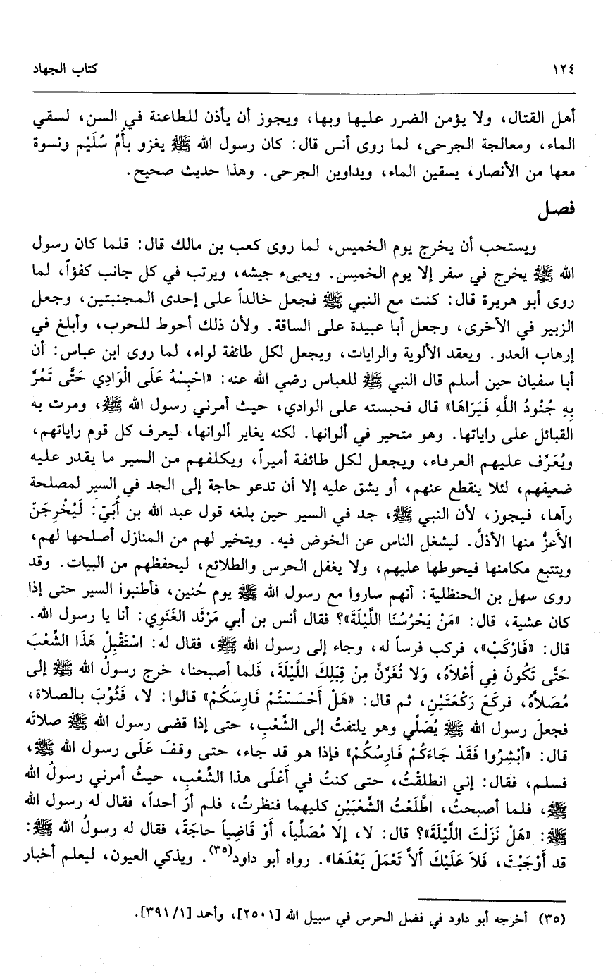 أهل القتال، ولا يؤمن الضرر عليها وبها، ويجوز أن يأذن للطاعنة في السن، لسقي الماء، ومعالجة الجرحى؛ لما روى أنس قال: «كان رسول الله - صَلَّى اللَّهُ عَلَيْهِ وَسَلَّمَ - يغزو بأم سليم ونسوة معها من الأنصار، يسقين الماء، ويداوين الجرحى.» وهذا حديث صحيح.