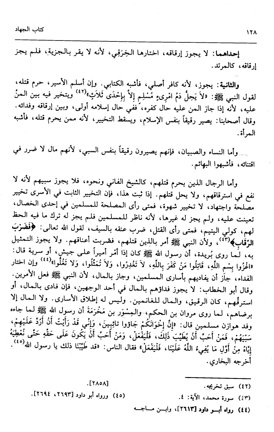 ، ولم يجز له غيرها؛ لأنه ناظر للمسلمين فلم يجز له ترك ما فيه الحظ لهم، كولي اليتيم، فمتى رأى القتل، ضرب عنقه بالسيف؛ لقول الله تعالى: {فَضَرْبَ الرِّقَابِ} [محمد: 4] ولأن النبي - صَلَّى اللَّهُ عَلَيْهِ وَسَلَّمَ - أمر بالذين قتلهم، فضربت أعناقهم، ولا يجوز التمثيل به؛ لما روى بريدة، «أن رسول الله - صَلَّى اللَّهُ عَلَيْهِ وَسَلَّمَ - كان إذا أمر أميراً على جيش، أو سرية قال: اغزوا بسم الله، قاتلوا من كفر بالله، لا تغدروا، ولا تمثلوا ولا تغلوا» وإن اختار الفداء، جاز أن يفاديهم بأسارى المسلمين، وجاز بالمال؛ لأن النبي - صَلَّى اللَّهُ عَلَيْهِ وَسَلَّمَ - فعل الأمرين. وقال أبو الخطاب: لا يجوز فداؤهم بالمال في أحد الوجهين، فإن فادى بالمال، أو استرقهم، كان الرقيق، والمال للغانمين. وليس له إطلاق الأسارى ولا المال إلا برضاهم؛ لما روى مروان بن الحكم والمسور بن مخرمة «أن رسول الله - صَلَّى اللَّهُ عَلَيْهِ وَسَلَّمَ - لما جاءه وفد هوازن مسلمين قال: إن إخوانكم جاءوا تائبين، وإني قد رأيت أن أرد عليهم سبيهم، فمن أحب أن يطيب ذلك، فليفعل، ومن أحب أن يكون على حقه حتى نعطيه إياه من أول ما يفيء الله علينا، فليفعل فقال الناس: قد طيبنا ذلك يا رسول الله.» أخرجه البخاري.