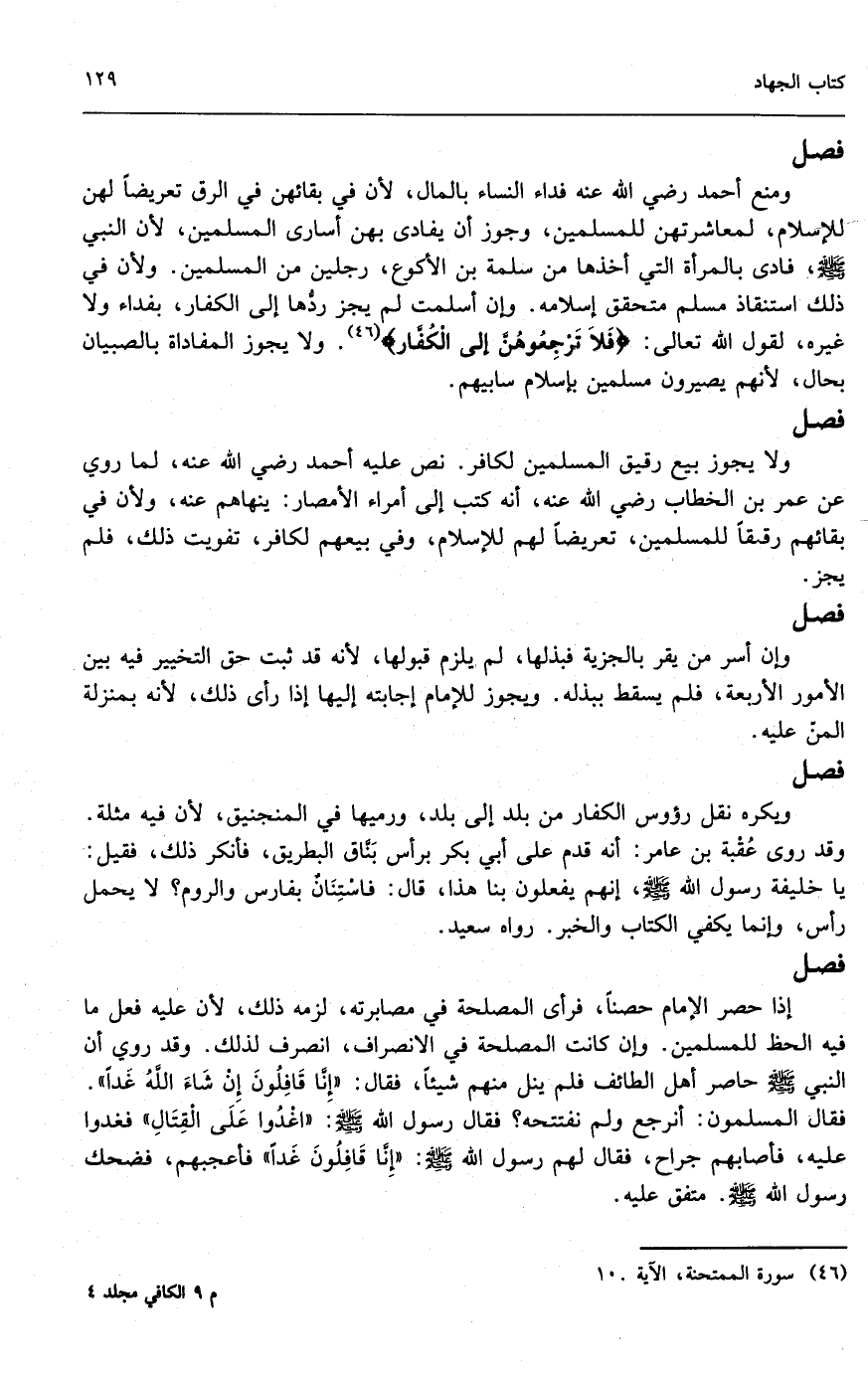 ومنع أحمد - رَضِيَ اللَّهُ عَنْهُ - فداء النساء بالمال؛ لأن في بقائهن في الرق تعريضا لهن للإسلام، لمعاشرتهن للمسلمين، وجوز أن يفادى بهن أسارى المسلمين؛ لأن النبي - صَلَّى اللَّهُ عَلَيْهِ وَسَلَّمَ -، فادى بالمرأة التي أخذها من سلمة بن الأكوع رجلين من المسلمين؛ ولأن في ذلك استنقاذ مسلم متحقق إسلامه. وإن أسلمت لم يجز ردها إلى الكفار، بفداء ولا غيره، لقول الله تعالى: {فَلا تَرْجِعُوهُنَّ إِلَى الْكُفَّارِ} [الممتحنة: 10] ، ولا يجوز المفاداة بالصبيان بحال؛ لأنهم يصيرون مسلمين بإسلام سابيهم.