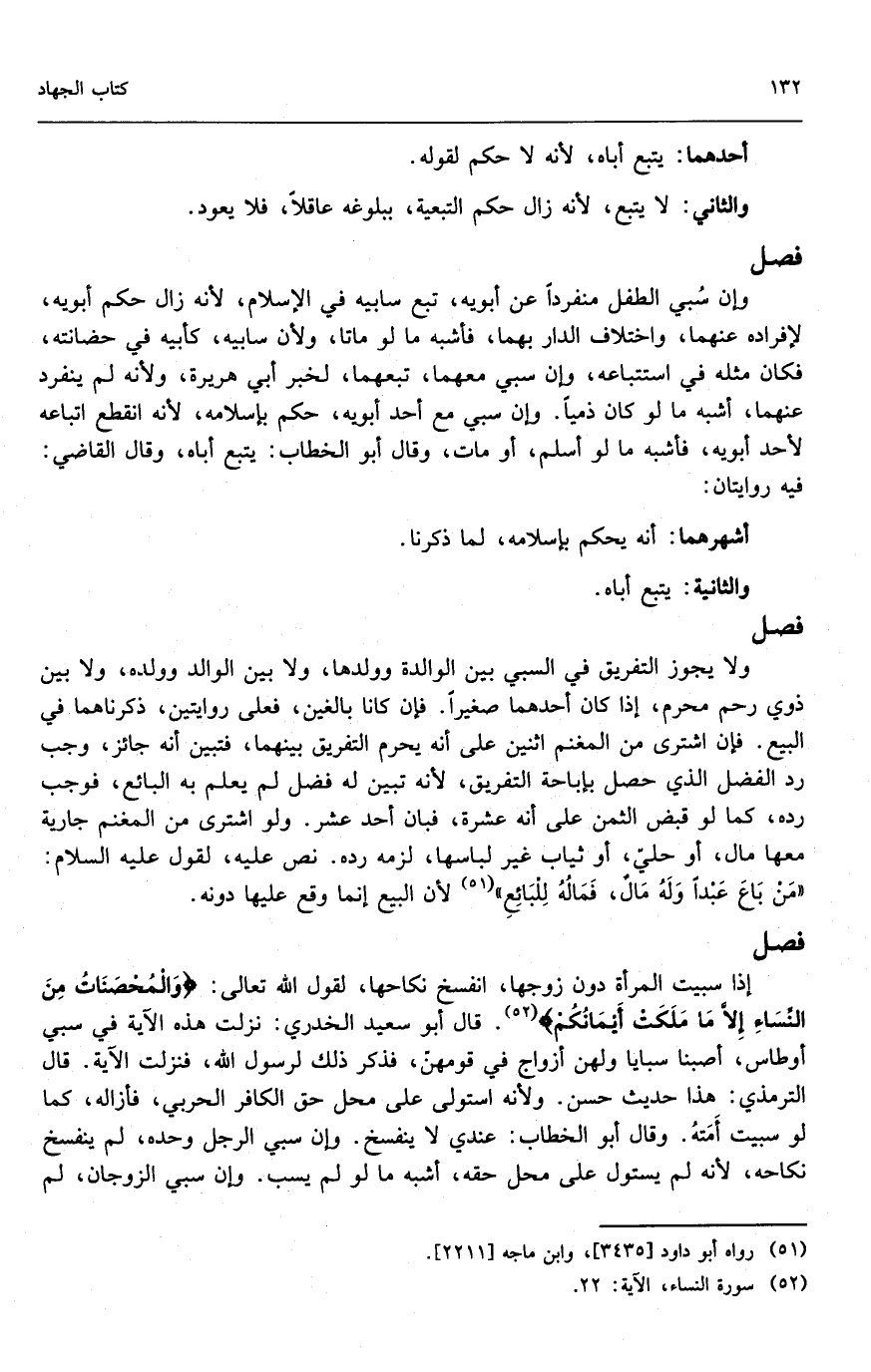 إذا سبيت المرأة دون زوجها، انفسخ نكاحها، لقول الله تعالى: « {وَالْمُحْصَنَاتُ مِنَ النِّسَاءِ إِلا مَا مَلَكَتْ أَيْمَانُكُمْ} [النساء: 24] . قال أبو سعيد الخدري: نزلت هذه الآية في سبي أوطاس، أصبنا سبايا ولهن أزواج في قومهن، فذكر ذلك لرسول الله، فنزلت الآية» . قال الترمذي: هذا حديث حسن؛ ولأنه استولى على محل حق الكافر الحربي، فأزاله، كما لو سبيت أمته. وقال أبو الخطاب: عندي لا ينفسخ. وإن سبي الرجل وحده، لم ينفسخ نكاحه؛ لأنه لم يستول على محل حقه، أشبه ما لو لم يسب؛ وإن سبي الزوجان، لم
