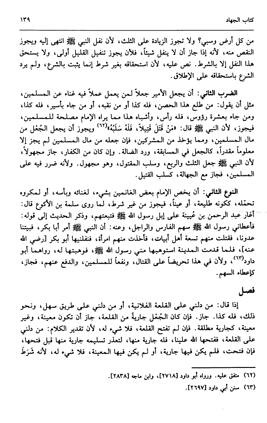 النوع الثاني: أن يخص الإمام بعض الغانمين بشيء، لغنائه وبأسه، أو لمكروه تحمله، ككونه طليعة، أو عينا، فيجوز من غير شرط، لما روى سلمة بن الأكوع قال: «أغار عبد الرحمن بن عيينة على إبل رسول الله - صَلَّى اللَّهُ عَلَيْهِ وَسَلَّمَ - فتبعتهم، وذكر الحديث إلى قوله: فأعطاني رسول الله - صَلَّى اللَّهُ عَلَيْهِ وَسَلَّمَ - سهم الفارس والراجل» ، وعنه: «أن النبي - صَلَّى اللَّهُ عَلَيْهِ وَسَلَّمَ - أمر أبا بكر، فبيتنا عدونا، فقتلت منهم تسعة أهل أبيات، فأخذت منهم امرأة، فنفلنيها أبو بكر - رَضِيَ اللَّهُ عَنْهُ -، فلما قدمت المدينة استوهبها مني رسول الله - صَلَّى اللَّهُ عَلَيْهِ وَسَلَّمَ -، فوهبتها له» ، رواهما أبو داود؛ ولأن في هذا تحريضا على القتال، ونفعا للمسلمين، والدفع عنهم، فجاز، كإعطاء السهم.