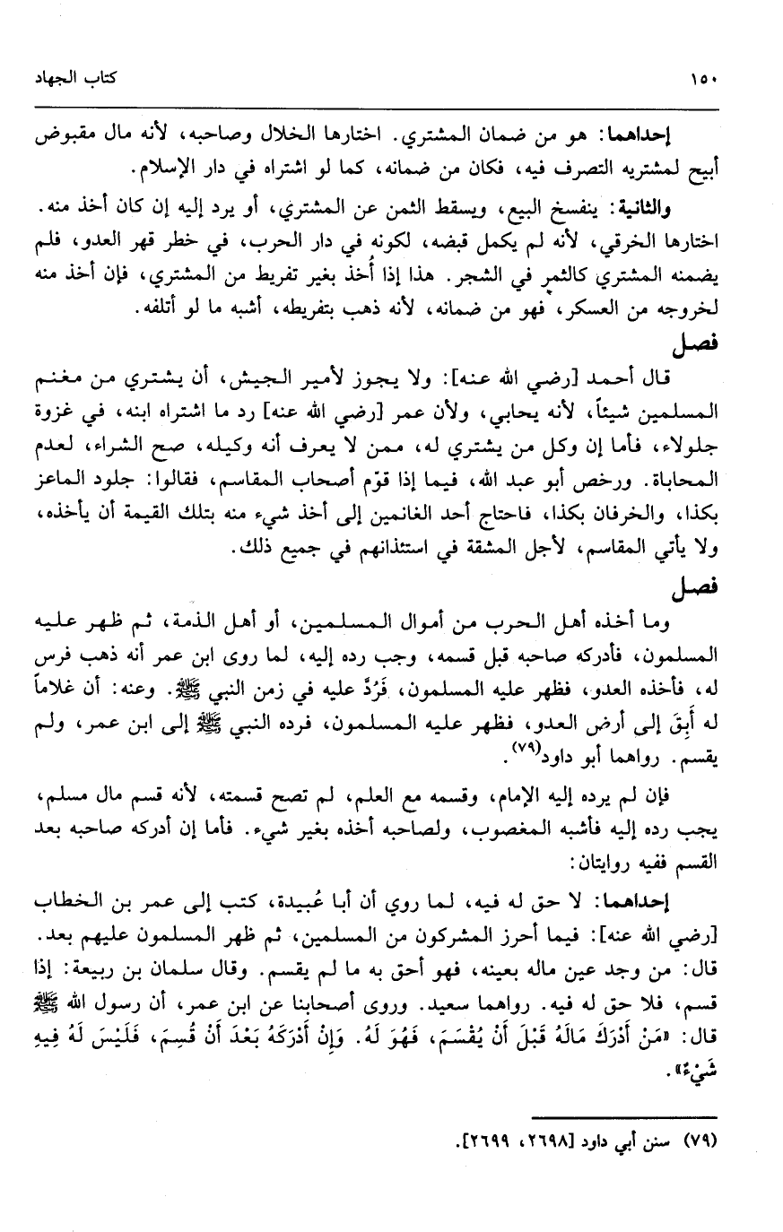 وما أخذه أهل الحرب من أموال المسلمين، أو أهل الذمة، ثم ظهر عليه المسلمون، فأدركه صاحبه قبل قسمه، وجب رده إليه، لما روى ابن عمر أنه ذهب فرس له، فأخذه العدو، فظهر عليه المسلمون فرد عليه في زمن النبي - صَلَّى اللَّهُ عَلَيْهِ وَسَلَّمَ -. وعنه: «أن غلاما له أبق إلى أرض العدو، فظهر عليه المسلمون، فرده النبي - صَلَّى اللَّهُ عَلَيْهِ وَسَلَّمَ - إلى ابن عمر، ولم يقسم» . رواهما أبو داود.
