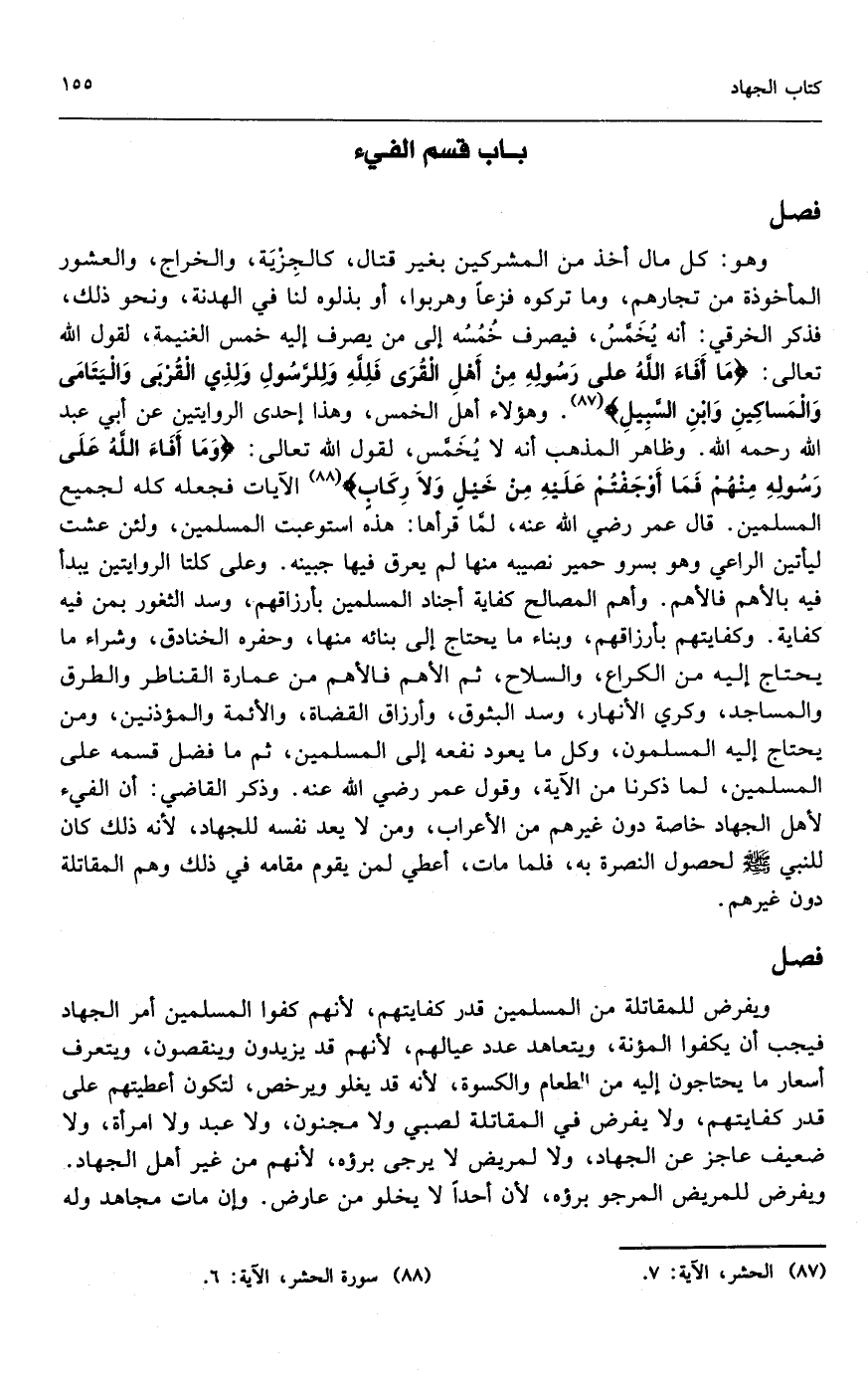 وهو: كل مال أخذ من المشركين بغير قتال كالجزية، والخراج، والعشور المأخوذة من تجارهم، وما تركوه فزعا وهربوا، أو بذلوه لنا في الهدنة، ونحو ذلك، فذكر الخرقي: أنه يخمس، فيصرف خمسه إلى من يصرف إليه خمس الغنيمة، لقول الله تعالى: {مَا أَفَاءَ اللَّهُ عَلَى رَسُولِهِ مِنْ أَهْلِ الْقُرَى فَلِلَّهِ وَلِلرَّسُولِ وَلِذِي الْقُرْبَى وَالْيَتَامَى وَالْمَسَاكِينِ وَابْنِ السَّبِيلِ} [الحشر: 7] وهؤلاء أهل الخمس، وهذا إحدى الروايتين عن أبي عبد الله - رَحِمَهُ اللَّهُ -. وظاهر المذهب أنه لا يخمس، لقول الله تعالى: {وَمَا أَفَاءَ اللَّهُ عَلَى رَسُولِهِ مِنْهُمْ فَمَا أَوْجَفْتُمْ عَلَيْهِ مِنْ خَيْلٍ وَلا رِكَابٍ} [الحشر: 6] ... الآيات. فجعله كله لجميع المسلمين. قال عمر - رَضِيَ اللَّهُ عَنْهُ -، لما قرأها: هذه استوعبت المسلمين، ولئن عشت ليأتين الراعي وهو بسرو حمير نصيبه منها لم يعرق فيها جبينه. وعلى كلتا الروايتين يبدأ فيه بالأهم فالأهم. وأهم المصالح كفاية أجناد المسلمين بأرزاقهم، وسد الثغور بمن فيه كفاية. وكفايتهم بأرزاقهم، وبناء ما يحتاج إلى بنائه منها، وحفره الخنادق، وشراء ما يحتاج إليه من الكراع والسلاح، ثم الأهم فالأهم من عمارة القناطر والطرق والمساجد، وكري الأنهار، وسد البثوق، وأرزاق القضاة، والأئمة، والمؤذنين، ومن يحتاج إليه المسلمون، وكل ما يعود نفعه إلى المسلمين، ثم ما فضل قسمه على المسلمين، لما ذكرنا من الآية، وقول عمر - رَضِيَ اللَّهُ عَنْهُ -. وذكر القاضي: أن الفيء لأهل الجهاد خاصة دون غيرهم من الأعراب، ومن لا يعد نفسه للجهاد؛ لأنه ذلك كان للنبي - صَلَّى اللَّهُ عَلَيْهِ وَسَلَّمَ - لحصول النصرة به، فلما مات أعطي لمن يقوم مقامه في ذلك، وهم المقاتلة دون غيرهم.