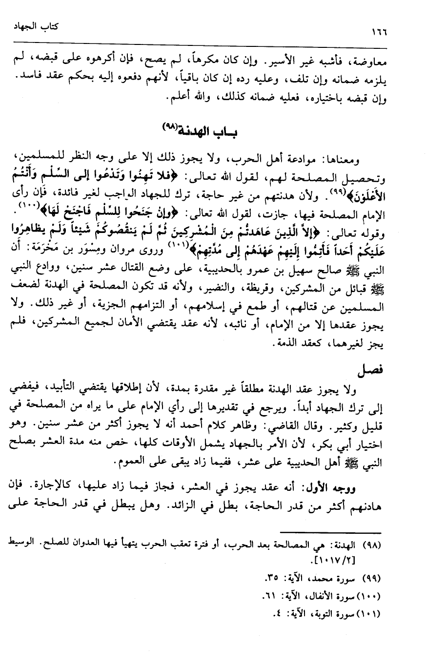 ومعناها: موادعة أهل الحرب، ولا يجوز ذلك إلا على وجه النظر للمسلمين، وتحصيل المصلحة لهم، لقول الله تعالى: {فَلا تَهِنُوا وَتَدْعُوا إِلَى السَّلْمِ وَأَنْتُمُ الأَعْلَوْنَ} [محمد: 35] ؛ ولأن هدنتهم من غير حاجة، ترك للجهاد الواجب لغير فائدة، فإن رأى الإمام المصلحة فيها، جازت، لقول الله تعالى: {وَإِنْ جَنَحُوا لِلسَّلْمِ فَاجْنَحْ لَهَا} [الأنفال: 61] ، وقَوْله تَعَالَى: {إِلا الَّذِينَ عَاهَدْتُمْ مِنَ الْمُشْرِكِينَ ثُمَّ لَمْ يَنْقُصُوكُمْ شَيْئًا وَلَمْ يُظَاهِرُوا عَلَيْكُمْ أَحَدًا فَأَتِمُّوا إِلَيْهِمْ عَهْدَهُمْ إِلَى مُدَّتِهِمْ} [التوبة: 4] ، وروى مروان ومسور بن مخرمة: «أن النبي - صَلَّى اللَّهُ عَلَيْهِ وَسَلَّمَ - صالح سهيل بن عمرو بالحديبية، على وضع القتال عشر سنين» ، ووادع النبي - صَلَّى اللَّهُ عَلَيْهِ وَسَلَّمَ - قبائل من المشركين، وقريظة، والنضير؛ ولأنه قد تكون المصلحة في الهدنة لضعف المسلمين عن قتالهم، أو طمع في إسلامهم، أو التزامهم الجزية، أو غير ذلك. ولا يجوز عقدها إلا من الإمام، أو نائبه؛ لأنه عقد يقتضي الأمان لجميع المشركين، فلم يجز لغيرهما، كعقد الذمة.