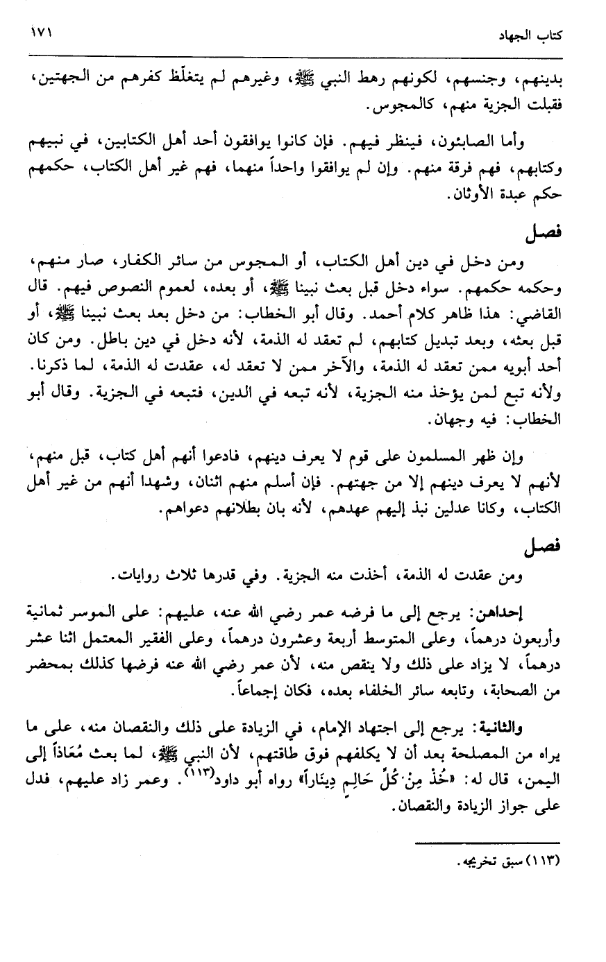 والثانية: يرجع إلى اجتهاد الإمام، في الزيادة على ذلك والنقصان منه، على ما يراه من المصلحة بعد أن لا يكلفهم فوق طاقتهم؛ «لأن النبي - صَلَّى اللَّهُ عَلَيْهِ وَسَلَّمَ - لما بعث معاذا إلى اليمن، قال له: خذ من كل حالم دينارا» رواه أبو داود. وعمر زاد عليهم، فدل على جواز الزيادة والنقصان.
