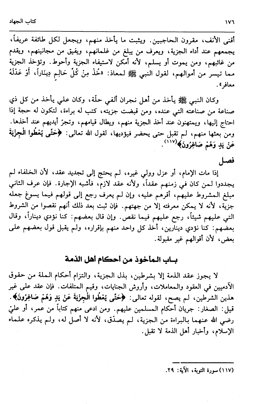 وكان النبي - صَلَّى اللَّهُ عَلَيْهِ وَسَلَّمَ - يأخذ من أهل نجران ألفي حلة، وكان علي يأخذ من كل ذي صناعة من صناعته التي عنده، ومن قبضت جزيته، كتب له براءة، لتكون له حجة إذا احتاج إليها، ويمتهنون عند أخذ الجزية منهم، ويطال قيامهم، وتجر أيديهم عند أخذها. ومن بعثها منهم، لم تقبل حتى يحضر فيؤديها، لقول الله تعالى: {حَتَّى يُعْطُوا الْجِزْيَةَ عَنْ يَدٍ وَهُمْ صَاغِرُونَ} [التوبة: 29] .