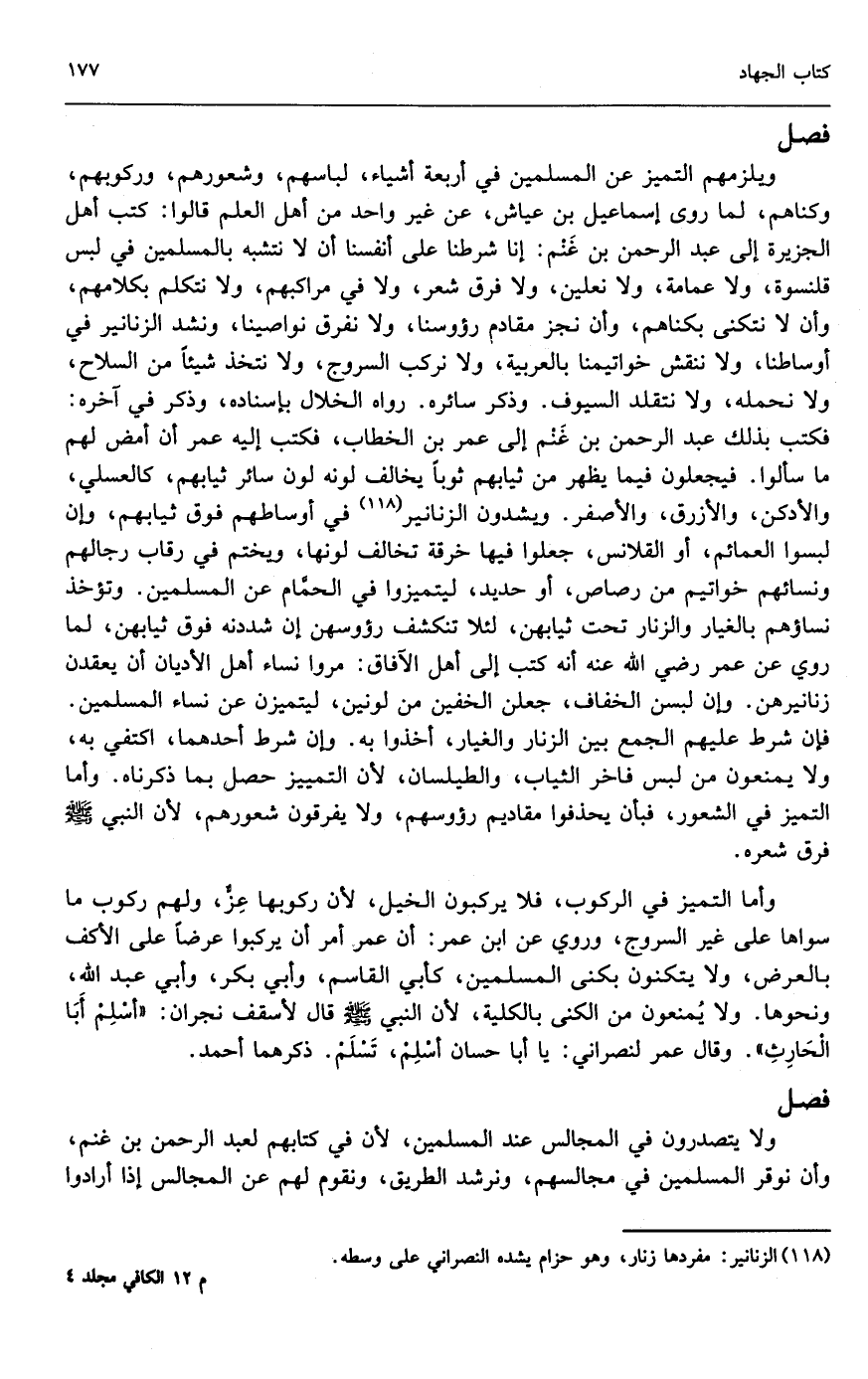 وذكر في آخره: فكتب بذلك عبد الرحمن بن غنم إلى عمر بن الخطاب، فكتب إليه عمر: أن أمض لهم ما سألوا. فيجعلون فيما يظهر من ثيابهم ثوبا يخالف لونه لون سائر ثيابهم، كالعسلي والأدكن، والأزرق، والأصفر. ويشدون الزنانير في أوساطهم فوق ثيابهم، وإن لبسوا العمائم، أو القلانس، جعلوا فيها خرقة تخالف لونها، ويختم في رقاب رجالهم ونسائهم خواتيم من رصاص، أو حديد، ليتميزوا في الحمام عن المسلمين. وتأخذ نساؤهم بالغيار والزنار تحت ثيابهن، لئلا تنكشف رءوسهن إن شددنه فوق ثيابهن، لما روي عن عمر - رَضِيَ اللَّهُ عَنْهُ - أنه كتب إلى أهل الآفاق: مروا نساء أهل الأديان أن يعقدن زنانيرهن. وإن لبسن الخفاف، جعلن الخفين من لونين، ليتميزن عن نساء المسلمين. فإن شرط عليهم الجمع بين الزنار والغيار، أخذوا به. وإن شرط أحدهما، اكتفي به، ولا يمنعون من لبس فاخر الثياب، والطيلسان؛ لأن التمييز حصل بما ذكرناه. وأما التميز في الشعور، فبأن يحذفوا مقاديم رءوسهم، ولا يفرقون شعورهم؛ لأن النبي - صَلَّى اللَّهُ عَلَيْهِ وَسَلَّمَ - فرق شعره.