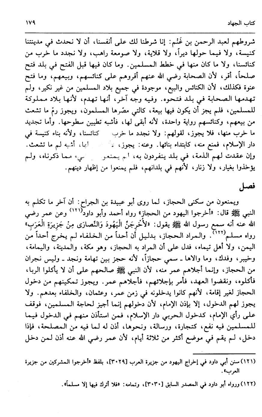 شروطهم لعبد الرحمن بن غنم: إن شرطنا لك على أنفسنا، أن لا نحدث في مدينتنا كنيسة ولا فيما حولها ديرا، ولا قلاية، ولا صومعة راهب، ولا نجدد ما خرب من كنائسنا، ولا ما كان منها في خطط المسلمين. وما كان فيها قبل الفتح في بلد فتح صلحا، أقر؛ لأن الصحابة - رَضِيَ اللَّهُ عَنْهُمْ - أقروهم على كنائسهم، وبيعهم، وما فتح عنوة فكذلك؛ لأن الكنائس والبيع، موجودة في جميع بلاد المسلمين من غير نكير، ولم تهدمها الصحابة في بلد فتحوه. وفيه وجه آخر، أنها تهدم لأنها بلاد مملوكة للمسلمين، فلم يجز أن يكون فيها بيعة، كالتي مصرها المسلمون، ويجوز رم ما تشعث من بيعهم وكنائسهم رواية واحدة؛ لأنه أبقى لها فأشبه تطيين سطوحها. وأما تجديد ما خرب منها فلا يجوز؛ لقولهم: ولا نجدد ما خرب من كنائسنا؛ ولأنه بناء كنيسة في دار الإسلام، فمنع منه كابتداء بنائها. وعنه: يجوز؛ لأنه أبقى لها، أشبه لَمْ مَا تشعث. وإن عقدت لهم الذمة في بلد ينفردون به، لم يمنعوا من شيء مما ذكرناه، ولم يأخذوا بغيار، ولا زنار؛ لأنهم في بلدانهم، فلم يمنعوا من إظهار دينهم.