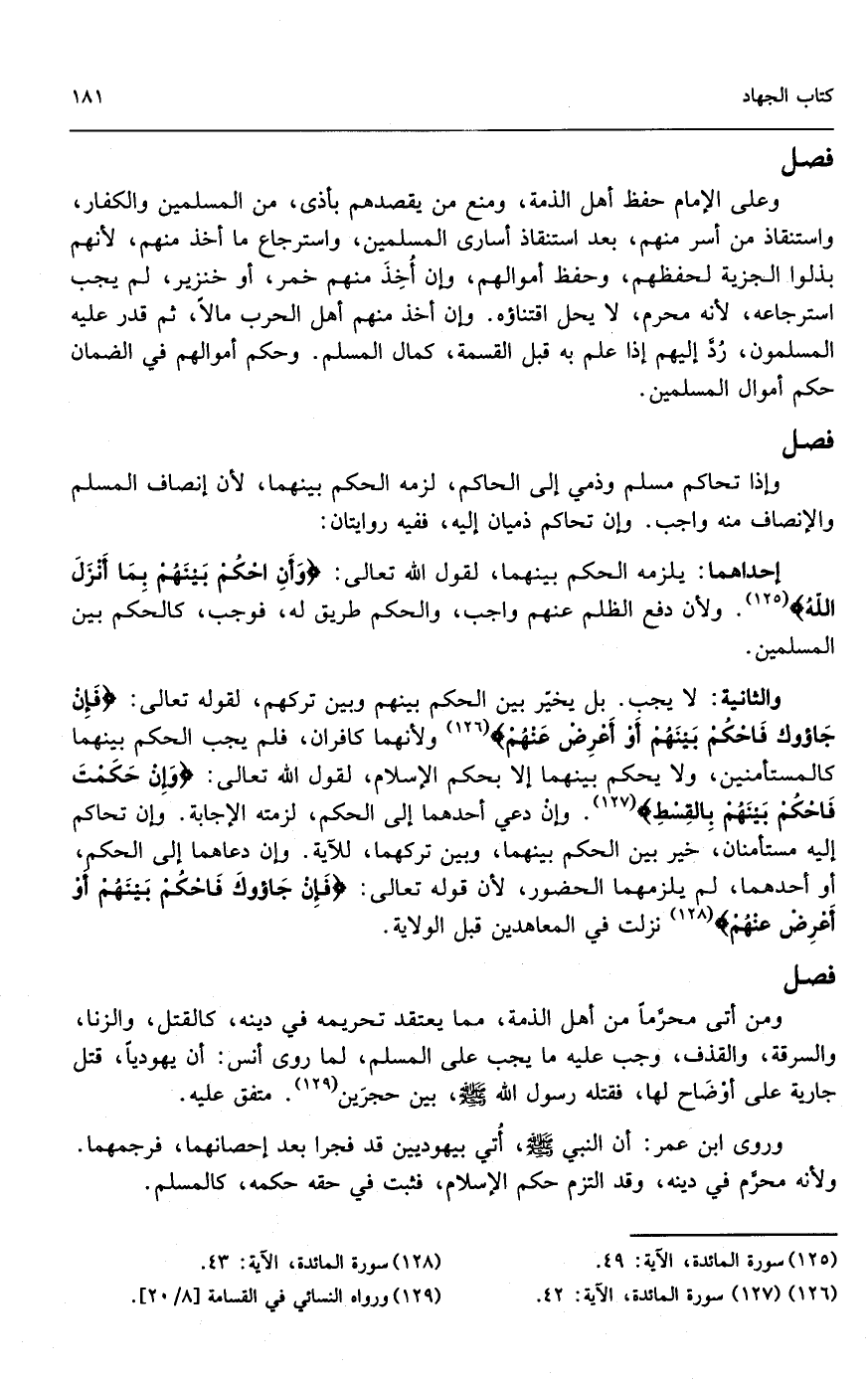 والثانية: لا يجب، بل يخير بين الحكم بينهم وبين تركهم، لقول الله تعالى: {فَإِنْ جَاءُوكَ فَاحْكُمْ بَيْنَهُمْ أَوْ أَعْرِضْ عَنْهُمْ} [المائدة: 42] ؛ ولأنهما كافران، فلم يجب الحكم بينهما كالمستأمنين، ولا يحكم بينهما إلا بحكم الإسلام، لقول الله تعالى: {وَإِنْ حَكَمْتَ فَاحْكُمْ بَيْنَهُمْ بِالْقِسْطِ} [المائدة: 42] ، وإن دعي أحدهما إلى الحكم، لزمته الإجابة، وإن تحاكم إليه مستأمنان، خير بين الحكم بينهما وبين تركهما، للآية. وإن دعاهما إلى الحكم أو أحدهما، لم يلزمهما الحضور؛ لأن قَوْله تَعَالَى: {فَإِنْ جَاءُوكَ فَاحْكُمْ بَيْنَهُمْ أَوْ أَعْرِضْ عَنْهُمْ} [المائدة: 42] نزلت في المعاهدين قبل الولاية.