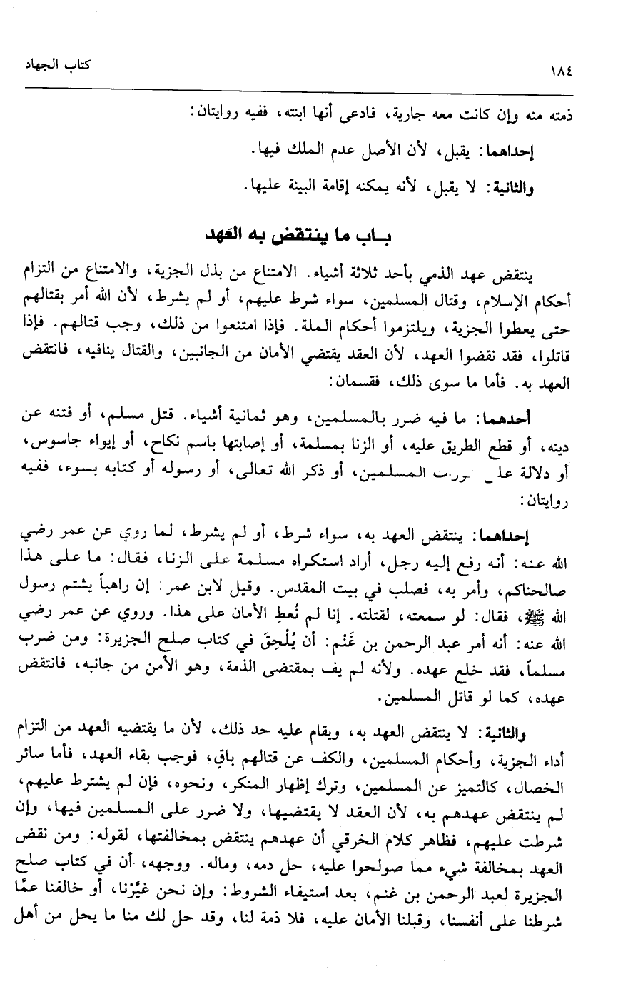 باب ما ينتقض به العهد ينتقض عهد الذمي بأحد ثلاثة أشياء: الامتناع من بذل الجزية، والامتناع من التزام أحكام الإسلام، وقتال المسلمين، سواء شرط عليهم أو لم يشرط؛ لأن الله أمر بقتالهم حتى يعطوا الجزية، ويلتزموا أحكام الملة، فإذا امتنعوا من ذلك وجب قتالهم. فإذا قاتلوا فقد نقضوا العهد؛ لأن العقد يقتضي الأمان من الجانبين، والقتال ينافيه، فانتقض العهد به. فأما ما سوى ذلك فقسمان: