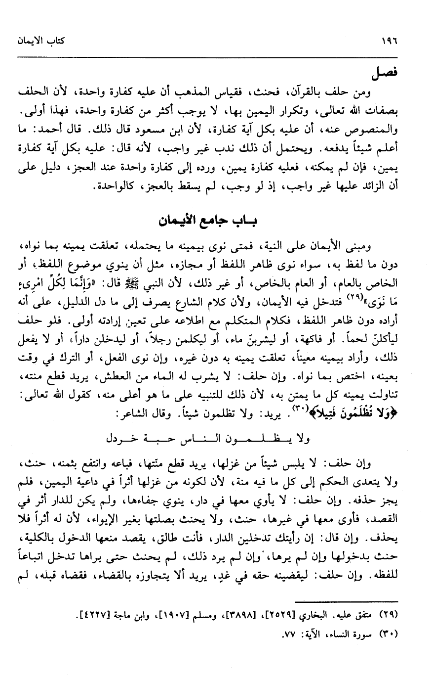 ومبنى الأيمان على النية، فمتى نوى بيمينه ما يحتمله، تعلقت يمينه بما نواه، دون ما لفظ به، سواء نوى ظاهر اللفظ أو مجازه، مثل أن ينوي موضوع اللفظ، أو الخاص بالعام، أو العام بالخاص، أو غير ذلك؛ لأن النبي - صَلَّى اللَّهُ عَلَيْهِ وَسَلَّمَ - قال: «وإنما لكل امرئ ما نوى» فتدخل فيه الأيمان؛ ولأن كلام الشارع يصرف إلى ما دل الدليل على أنه أراده دون ظاهر اللفظ، فكلام المتكلم مع اطلاعه على تعين إرادته أولى. فلو حلف ليأكلن لحماً أو فاكهة، أو ليشربن ماء، أو ليكلمن رجلاً، أو ليدخلن داراً، أو لا يفعل ذلك، وأراد بيمينه معيناً، تعلقت يمينه به دون غيره، وإن نوى الفعل أو الترك في وقت بعينه، اختص بما نواه. وإن حلف لا يشرب له الماء من العطش، يريد قطع منته، تناولت يمينه كل ما يمتن به؛ لأن ذلك للتنبيه على ما هو أعلى منه، كقول الله تعالى: {وَلا تُظْلَمُونَ فَتِيلا} [النساء: 77] . يريد: ولا تظلمون شيئاً. وقال الشاعر: