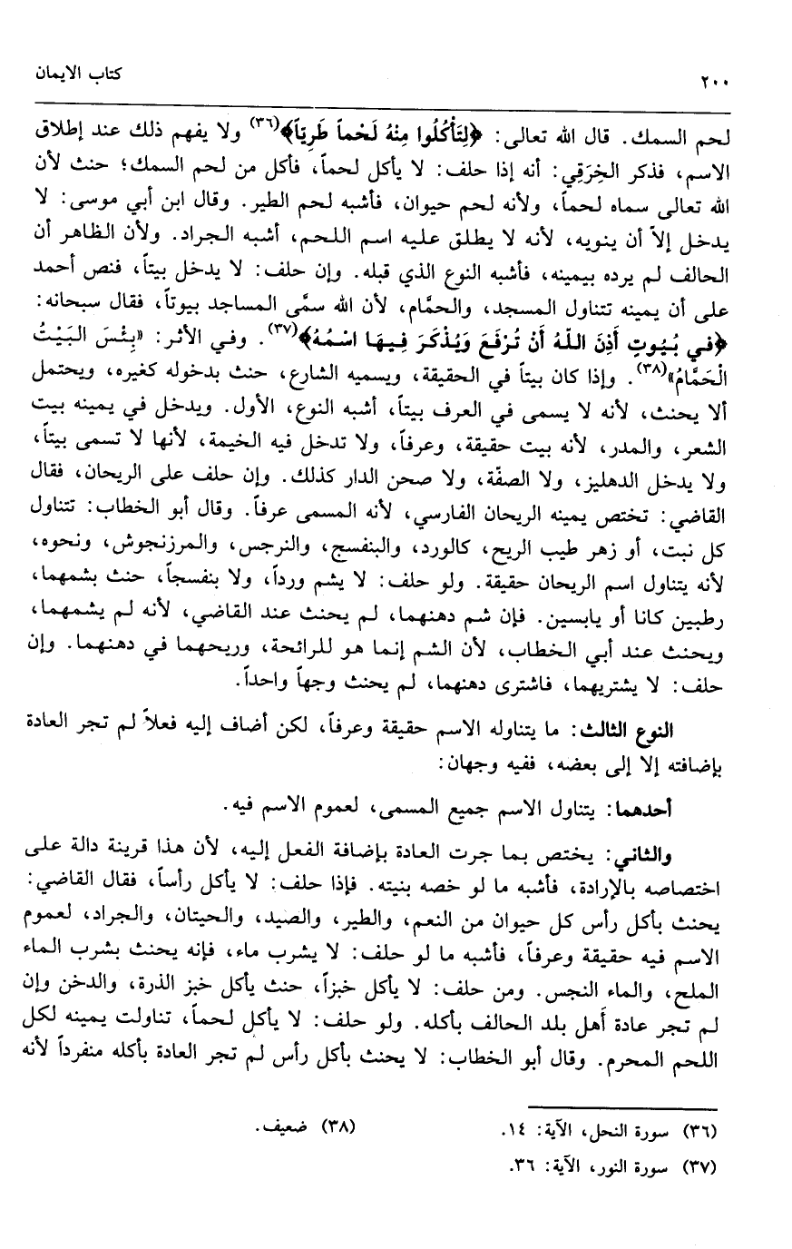 لحم السمك. قال الله تعالى: {لِتَأْكُلُوا مِنْهُ لَحْمًا طَرِيًّا} [النحل: 14] ولا يفهم ذلك عند إطلاق الاسم، فذكر الخرقي أنه إذا حلف: لا يأكل لحماً، فأكل من لحم السمك، حنث لأن الله تعالى سماه لحماً؛ ولأنه لحم حيوان، فأشبه لحم الطير. وقال ابن أبي موسى: لا يدخل إلا أن ينويه؛ لأنه لا يطلق عليه اسم اللحم، أشبه الجراد؛ ولأن الظاهر أن الحالف لم يرده بيمينه، فأشبه النوع الذي قبله. وإن حلف: لا يدخل بيتاً، فنص أحمد على أن يمينه تتناول المسجد والحمام؛ لأن الله سمى المساجد بيوتاً، فقال سبحانه: {فِي بُيُوتٍ أَذِنَ اللَّهُ أَنْ تُرْفَعَ وَيُذْكَرَ فِيهَا اسْمُهُ} [النور: 36] . وفي الأثر: «بئس البيت الحمام» . وإذا كان بيتاً في الحقيقة، ويسميه الشارع، حنث بدخوله كغيره، ويحتمل ألا يحنث؛ لأنه لا يسمى في العرف بيتاً، أشبه النوع الأول. ويدخل في يمينه بيت الشعر والمدر؛ لأنه بيت حقيقة وعرفاً، ولا تدخل فيه الخيمة؛ لأنها لا تسمى بيتاً، ولا يدخل الدهليز، ولا الصفة، ولا صحن الدار كذلك. وإن حلف على الريحان، فقال القاضي. تختص يمينه الريحان الفارسي؛ لأنه المسمى عرفاً. وقال أبو الخطاب. تتناول كل نبت أو زهر طيب الريح، كالورد، والبنفسج، والنرجس، والمرزنجوش، ونحوه؛ لأنه يتناول اسم الريحان حقيقة. ولو حلف: لا يشم ورداً، ولا بنفسجاً، حنث بشمهما، رطبين كانا أو يابسين. فإن شم دهنهما، لم يحنث عند القاضي؛ لأنه لم يشمهما، ويحنث عند أبي الخطاب؛ لأن الشم إنما هو للرائحة، وريحهما في دهنهما. وإن حلف: لا يشتريهما، فاشترى دهنهما، لم يحنث وجهاً واحداً.