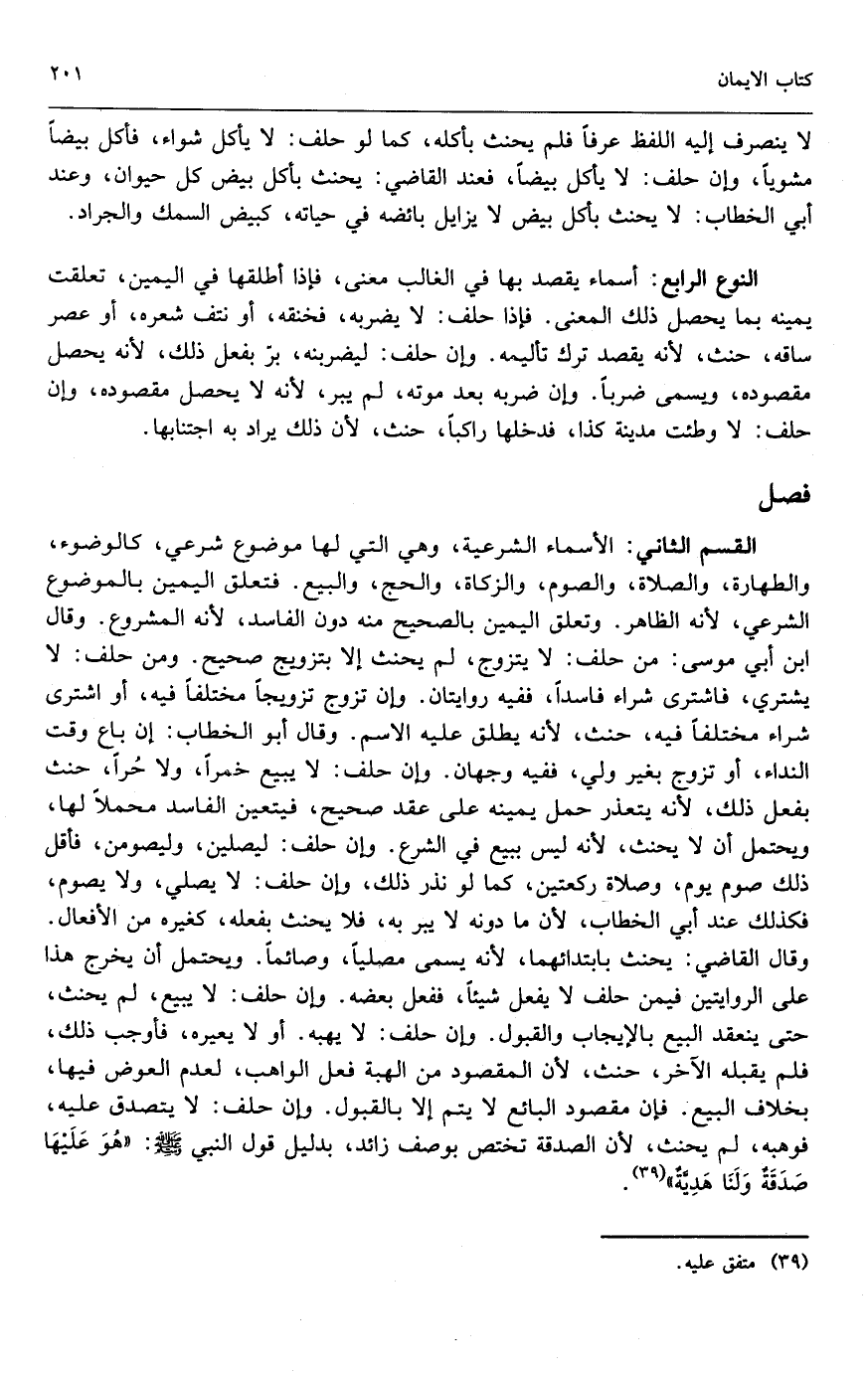 القسم الثاني: الأسماء الشرعية، وهي التي لها موضوع شرعي، كالوضوء، والطهارة، والصلاة، والصوم، والزكاة، والحج، والبيع. فتعلق اليمين بالموضوع الشرعي؛ لأنه الظاهر. وتعلق اليمين بالصحيح منه دون الفاسد؛ لأنه المشروع. وقال ابن أبي موسى: من حلف لا يتزوج، لم يحنث إلا بتزويج صحيح. ومن حلف لا يشتري، فاشترى شراء فاسداً، ففيه روايتان. وإن تزوج تزويجاً مختلفاً فيه، أو اشترى شراء مختلفاً فيه، حنث؛ لأنه يطلق عليه الاسم. وقال أبو الخطاب: إن باع وقت النداء، أو تزوج بغير ولي، ففيه وجهان. وإن حلف: لا يبيع خمراً ولا حراً، حنث بفعل ذلك؛ لأنه يتعذر حمل يمينه على عقد صحيح، فيتعين الفاسد محملاً لها، ويحتمل أن لا يحنث؛ لأنه ليس ببيع في الشرع. وإن حلف: ليصلين وليصومن، فأقل ذلك صوم يوم، وصلاة ركعتين، كما لو نذر ذلك، وإن حلف: لا يصلي، ولا يصوم، فكذلك عند أبي الخطاب؛ لأن ما دونه لا يبر به، فلا يحنث بفعله، كغيره من الأفعال. وقال القاضي: يحنث بابتدائهما؛ لأنه يسمى مصلياً، وصائماً. ويحتمل أن يخرج هذا على الروايتين فيمن حلف لا يفعل شيئاً، ففعل بعضه. وإن حلف: لا يبيع، لم يحنث، حتى ينعقد البيع بالإيجاب والقبول. وإن حلف: لا يهبه. أو لا يعيره، فأوجب ذلك، فلم يقبل الآخر، حنث؛ لأن المقصود من الهبة فعل الواهب، لعدم العوض فيها، بخلاف البيع. فإن مقصود البائع لا يتم إلا بالقبول. وإن حلف: لا يتصدق عليه، فوهبه، لم يحنث؛ لأن الصدقة تختص بوصف زائد، بدليل قول النبي - صَلَّى اللَّهُ عَلَيْهِ وَسَلَّمَ -: «هو عليها صدقة ولنا هدية» .