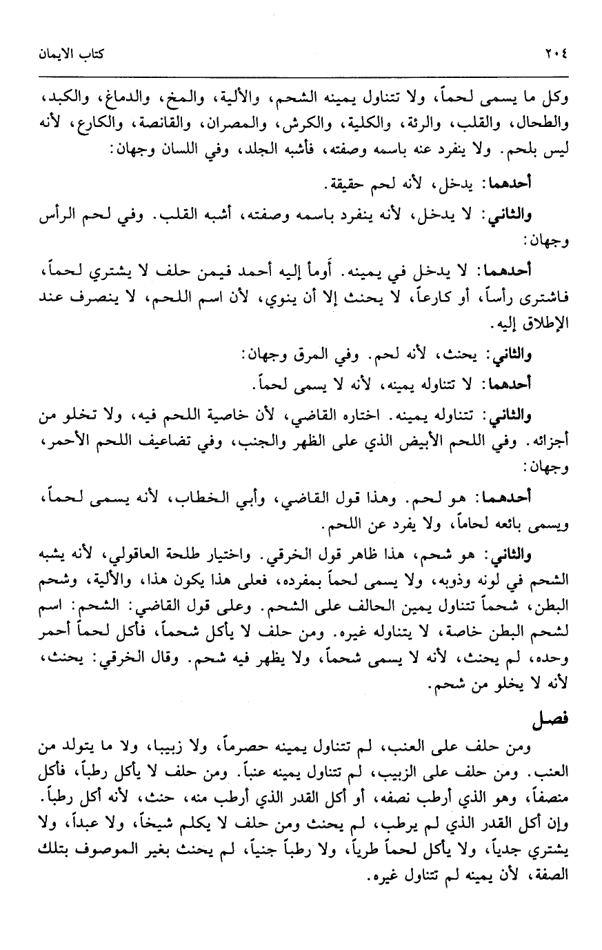 والثاني: هو شحم، هذا ظاهر قول الخرقي. واختيار طلحة العاقولي؛ لأنه يشبه الشحم في لونه وذوبه، ولا يسمى لحماً بمفرده، فعلى هذا يكون هذا، والألية، وشحم البطن، شحم تتناوله يمين الحالف على الشحم. وعلى قول القاضي: الشحم: اسم لشحم البطن خاصة، لا يتناوله غيره. ومن حلف لا يأكل شحماً، فأكل لحماً أحمر وحده، لم يحنث؛ لأنه لا يسمى شحماً، ولا يظهر فيه شحم. وقال الخرقي: يحنث؛ لأنه لا يخلو من شحم.