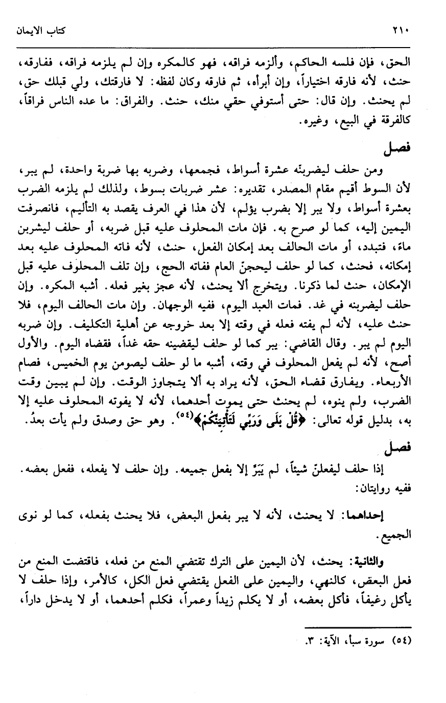 والثانية: يحنث؛ لأن اليمين على الترك تقتضي المنع من فعله، فاقتضت المنع من فعل البعض، كالنهي، واليمين على الفعل يقتضي فعل الكل، كالأمر، وإذا حلف لا يأكل رغيفاً، فأكل بعضه، أو لا يكلم زيداً وعمراً، فكلم أحدهما، أو لا يدخل داراً،