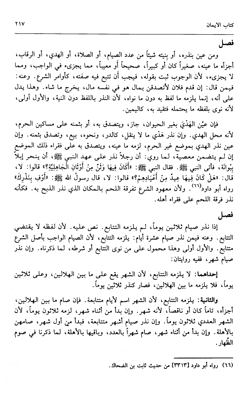 ومن عين بنذره أو بنيته شيئاً من عدد الصيام، أو الصلاة، أو الهدي، أو الرقاب، أجزأه ما عينه، صغيراً كان أو كبيراً، صحيحاً أو معيباً، مما يجزئ في الواجب، ومما لا يجزئ؛ لأن الوجوب ثبت بقوله، فيجب أن تتبع فيه صفته، كأوامر الشرع. وعنه فيمن قال: إن قدم فلان لأتصدقن بمال، هو في نفسه مال، يخرج ما شاء. وهذا يدل على أنه إنما يلزمه ما لفظ به دون ما نواه؛ لأن النذر باللفظ دون النية، والأولى أولى؛ لأنه نوى بلفظه ما يحتمله فتقيد به، كاليمين.