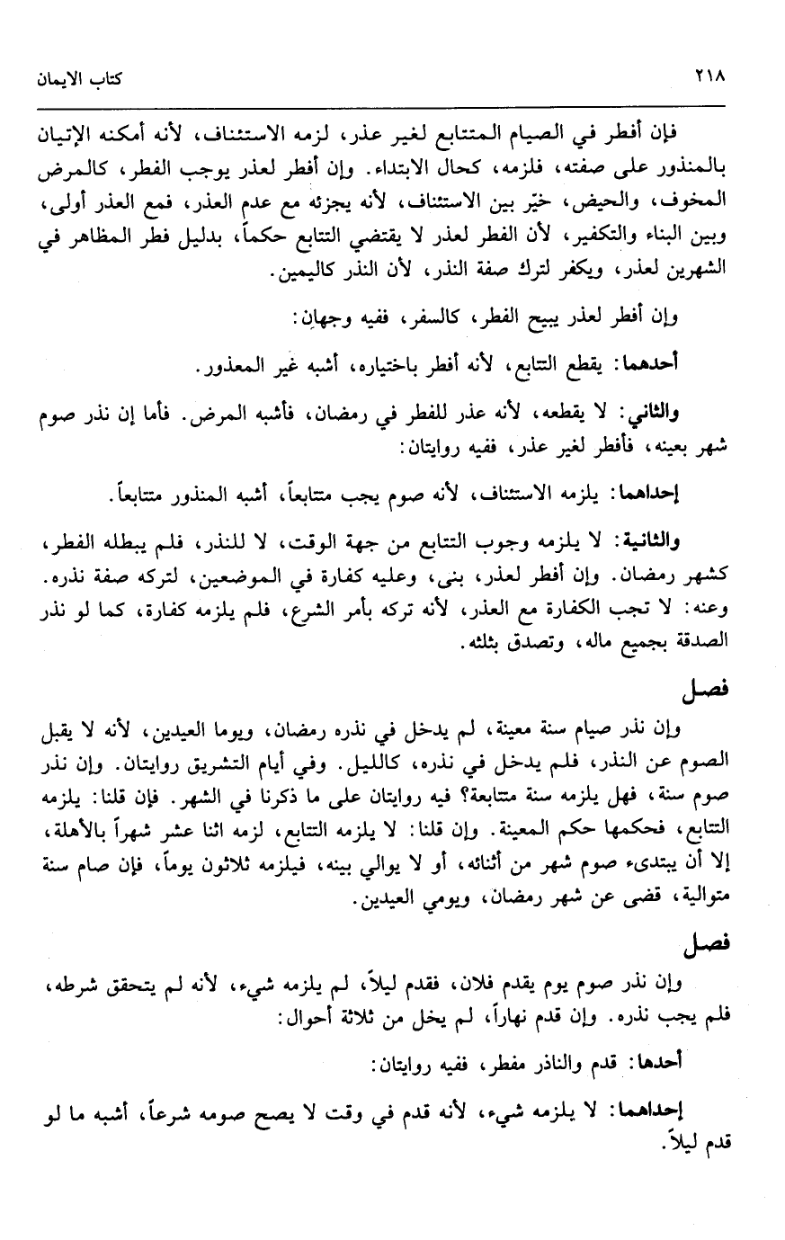 والثانية: لا يلزمه وجوب التتابع من جهة الوقت، لا للنذر، فلم يبطله الفطر كشهر رمضان. وإن أفطر لعذر، بنى، وعليه كفارة في الموضعين، لتركه صفة نذره.