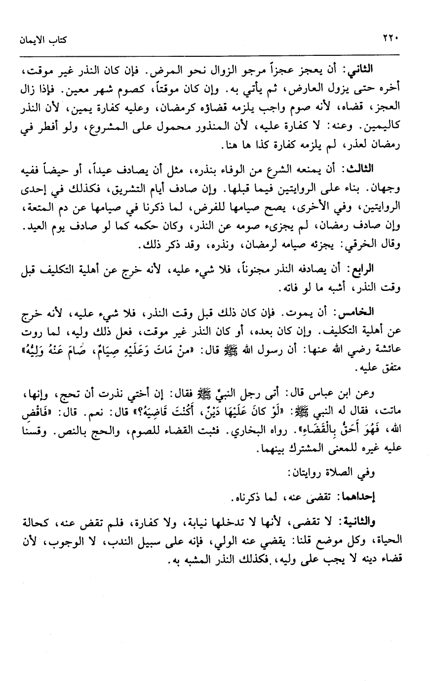 الثاني: أن يعجز عجزاً مرجو الزوال نحو المرض. فإذا كان النذر غير موقت، أخره حتى يزول العارض ثم يأتي به، وإن كان موقتاً، كصوم شهر معين. فإذا زال العجز قضاه؛ لأنه صوم واجب يلزمه قضاؤه كرمضان، وعليه كفارة اليمين؛ لأن النذر كاليمين. وعنه: لا كفارة عليه؛ لأن المنذور محمول على المشروع، ولو أفطر في رمضان لعذر، لم يلزمه كفارة، كذا هاهنا.