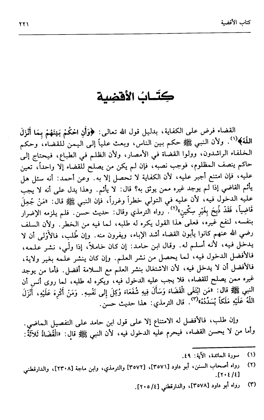 القضاء فرض على الكفاية، بدليل قول الله تعالى: {وَأَنِ احْكُمْ بَيْنَهُمْ بِمَا أَنْزَلَ اللَّهُ} [المائدة: 49] ولأن النبي - صَلَّى اللَّهُ عَلَيْهِ وَسَلَّمَ - حكم بين الناس، وبعث علياً إلى اليمن للقضاء، وحكم الخلفاء الراشدون، وولوا القضاة في الأمصار؛ ولأن الظلم في الطباع، فيحتاج إلى حاكم ينصف المظلوم، فوجب نصبه، فإن لم يكن من يصلح للقضاء إلا واحداً، تعين عليه، فإن امتنع أجبر عليه؛ لأن الكفاية لا تحصل إلا به، وعن أحمد: أنه سئل هل يأثم القاضي إذا لم يوجد غيره ممن يوثق به؟ قال: لا يأثم. وهذا يدل على أنه لا يجب عليه الدخول فيه؛ لأن عليه في التولي خطراً وغرراً، فإن النبي - صَلَّى اللَّهُ عَلَيْهِ وَسَلَّمَ - قال: «من جُعل قاضياً، فقد ذبح بغير سكين» . رواه الترمذي وقال: حديث حسن. فلم يلزمه الإضرار بنفسه لنفع غيره، فعلى هذا القول يكره له طلبه، لما فيه من الخطر؛ ولأن السلف - رَضِيَ اللَّهُ عَنْهُمْ - كانوا يأبون القضاء أشد الإباء ويفرون منه. وإن طلب فالأولى أن لا يدخل فيه؛ لأنه أسلم له. وقال ابن حامد: إن كان خاملاً، إذا ولي نشر علمه، فالأفضل الدخول فيه، لما يحصل من نشر العلم. وإن كان ينشر علمه بغير ولاية، فالأفضل أن لا يدخل فيه؛ لأن الاشتغال بنشر العلم مع السلامة أفضل. فأما من يوجد غيره ممن يصلح للقضاء، فلا يجب عليه الدخول فيه، ويكره له طلبه، لما روى أنس أن النبي - صَلَّى اللَّهُ عَلَيْهِ وَسَلَّمَ - قال: «من ابتغى القضاء وسأل فيه شفعاء وكل إلى نفسه، ومن أكره عليه أنزل الله عليه ملكاً يسدده» . قال الترمذي: هذا حديث حسن.