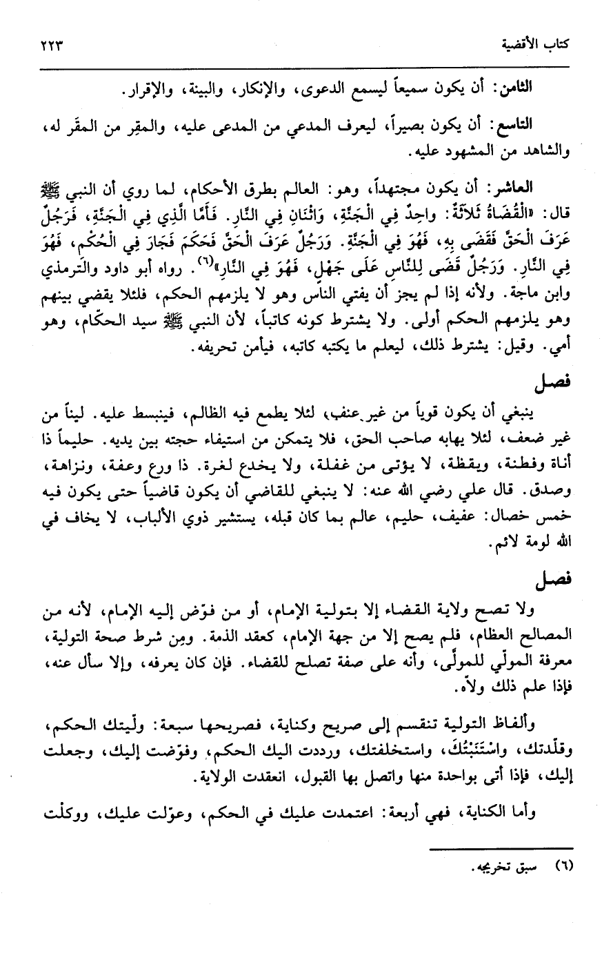 العاشر: أن يكون مجتهداً، وهو العالم بطرق الأحكام، لما روي أن النبي - صَلَّى اللَّهُ عَلَيْهِ وَسَلَّمَ - قال: «القضاة ثلاثة واحد في الجنة، واثنان في النار. فأما الذي في الجنة، فرجل عرف الحق فقضى به، فهو في الجنة. ورجل عرف الحق فحكم فجار في الحكم، فهو في النار. ورجل قضى للناس على جهل، فهو في النار» . رواه أبو داود والترمذي وابن ماجه؛ ولأنه إذا لم يجز أن يفتي الناس وهو لا يلزمهم الحكم، فلئلا يقضي بينهم وهو يلزمهم الحكم أولى. ولا يشترط كونه كاتباً؛ لأن النبي - صَلَّى اللَّهُ عَلَيْهِ وَسَلَّمَ - سيد الحكام، وهو أمي. وقيل: يشترط؛ ليعلم ما يكتبه كاتبه، فيأمن تحريفه.