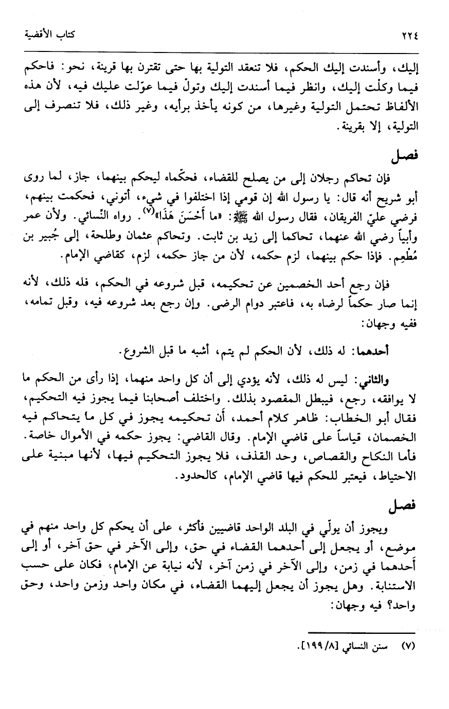 والثاني: ليس له ذلك؛ لأنه يؤدي إلى أن كل واحد منهما، إذا رأى من الحكم ما لا يوافقه، رجع، فيبطل المقصود بذلك. واختلف أصحابنا فيما يجوز فيه التحكيم، فقال أبو الخطاب: ظاهر كلام أحمد أن تحكيمه يجوز في كل ما يتحاكم فيه الخصمان، قياساً على قاضي الإمام. وقال القاضي: يجوز حكمه في الأموال الخاصة. فأما النكاح والقصاص، وحد القذف، فلا يجوز التحكيم فيها؛ لأنها مبنية على الاحتياط، فيعتبر للحكم فيها قاضي الإمام، كالحدود.