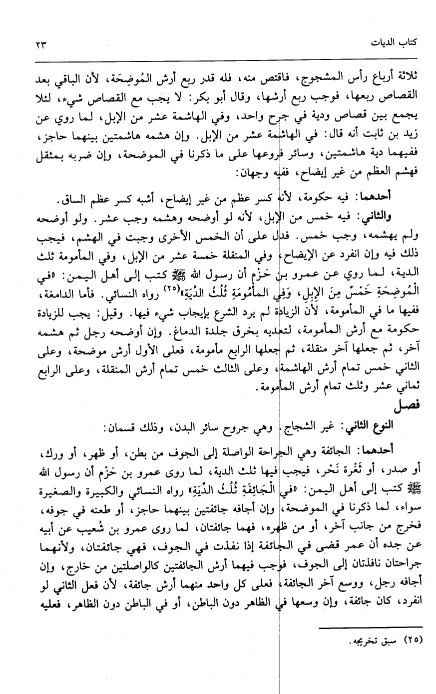 ثلاثة أرباع رأس المشجوج، فاقتص منه، فله ربع أرش الموضحة؛ لأن الباقي بعد القصاص ربعها، فوجب ربع أرشها، وقال أبو بكر: لا يجب مع القصاص شيء؛ لئلا يجمع بين قصاص ودية في جرح واحد، وفي الهاشمة عشر من الإبل؛ لما روي عن زيد بن ثابت أنه قال: في الهاشمة عشر من الإبل، وإن هشمه هاشمتين بينهما حاجز، ففيهما دية هاشمتين، وسائر فروعها على ما ذكرنا في الموضحة، وإن ضربه بمثقل فهشم العظم من غير إيضاح، ففيه وجهان: