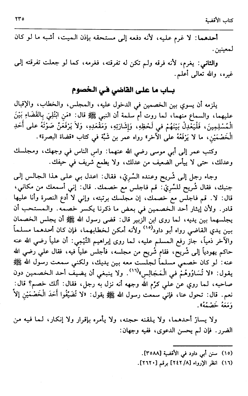 يلزمه أن يسوي بين الخصمين في الدخول عليه، والمجلس، والخطاب، والإقبال عليهما، والسماع منهما، لما روت أم سلمة أن النبي - صَلَّى اللَّهُ عَلَيْهِ وَسَلَّمَ - قال: «من ابتلي بالقضاء بين المسلمين، فليعدل بينهم في لحظه، وإشارته، ومقعده، ولا يرفعن صوته على أحد الخصمين، ما لا يرفعه على الآخر» رواه عمر بن شيبة في كتاب قضاة البصرة.