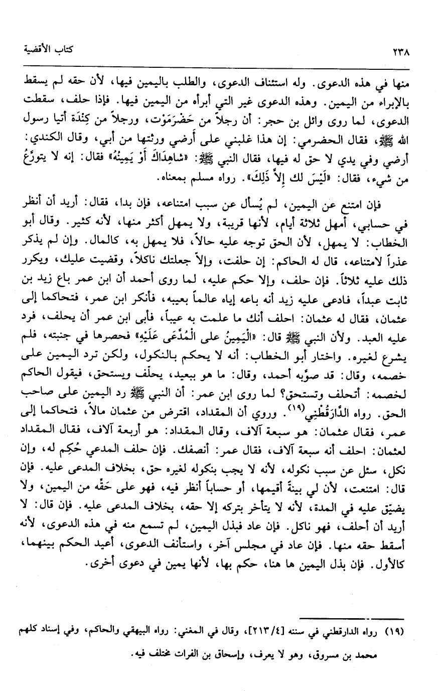 فإن امتنع عن اليمين لم يسأل عن سبب امتناعه، فإن بدا فقال: أريد أن أنظر في حسابي، أمهل ثلاثة أيام؛ لأنها قريبة، ولا يمهل أكثر منها؛ لأنه كثير. وقال أبو الخطاب: لا يمهل لأن الحق توجه عليه حالاً، فلا يمهل به، كالمال. وإن لم يذكر عذراً لامتناعه، قال له الحاكم: إن حلفت وإلا جعلتك ناكلاً وقضيت عليك، ويكرر ذلك عليه ثلاثاً، فإن حلف، وإلا حكم عليه، لما روى أحمد أن ابن عمر باع زيد بن ثابت عبداً، فادعى عليه زيد أنه باعه إياه عالماً بعيبه، فأنكر ابن عمر، فتحاكما إلى عثمان، فقال له عثمان: احلف أنك ما علمت به عيباً، فأبى ابن عمر أن يحلف، فرد عليه العبد؛ ولأن النبي - صَلَّى اللَّهُ عَلَيْهِ وَسَلَّمَ - قال: «اليمين على المدعى عليه» فحصرها في جنبته، فلم يشرع لغيره. واختار أبو الخطاب أنه لا يحكم بالنكول، ولكن ترد اليمين على خصمه، وقال: قد صوبه أحمد، وقال: ما هو ببعيد، يحلف ويستحق، فيقول الحاكم لخصمه: أتحلف وتستحق؟ لما روى ابن عمر: «أن النبي - صَلَّى اللَّهُ عَلَيْهِ وَسَلَّمَ - رد اليمين على صاحب الحق» . رواه الدارقطني. وروي أن المقداد اقترض من عثمان مالاً، فتحاكما إلى عمر، فقال عثمان: هو سبعة آلاف، وقال المقداد: هو أربعة آلاف، فقال المقداد لعثمان: احلف أنه سبعة آلاف، فقال عمر: أنصفك. فإن حلف المدعي حكم له، وإن نكل سئل عن سبب نكوله؛ لأنه لا يجب بنكوله لغيره حق، بخلاف المدعى عليه. فإن قال: امتنعت؛ لأن لي بينة أقيمها، أو حساباً أنظر فيه، فهو على حقه من اليمين، ولا يضيق عليه في المدة؛ لأنه لا يتأخر بتركه إلا حقه، بخلاف المدعى عليه. فإن قال: لا أريد أن أحلف، فهو ناكل. فإن عاد فبذل اليمين، لم تسمع منه في هذه الدعوى؛ لأنه أسقط حقه منها. فإن عاد في مجلس آخر، واستأنف الدعوى، أعيد الحكم بينهما، كالأول. فإن بذل اليمين هاهنا حكم بها؛ لأنها يمين في دعوى أخرى.
