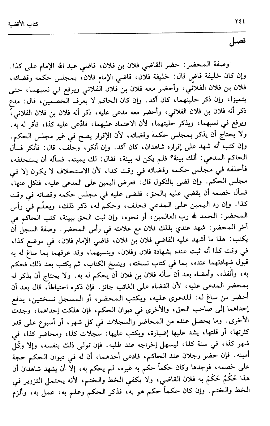 وصفة المحضر: حضر القاضي فلان ابن فلان، قاضي عبد الله الإمام على كذا. وإن كان خليفة قاض قال: خليفة فلان: قاضي الإمام فلان، بمجلس حكمه وقضائه، فلان ابن فلان الفلاني، وأحضر معه فلان ابن فلان الفلاني، ويرفع في نسبهما، حتى يتميزا، وإن ذكر حليتهما، كان آكد. وإن كان الحاكم لا يعرف الخصمين، قال: مدع ذكر أنه فلان ابن فلان الفلاني، وأحضر معه مدعى عليه، ذكر أنه فلان ابن فلان الفلاني، ويرفع في نسبهما، ويذكر حليتهما؛ لأن الاعتماد عليهما، فادعى عليه كذا، فأقر له به. ولا يحتاج أن يذكر بمجلس حكمه وقضائه؛ لأن الإقرار يصح في غير مجلس الحكم. وإن كتب أنه شهد على إقراره شاهدان، كان آكد. وإن أنكر وحلف، قال: فأنكر فسأل الحاكم المدعي: ألك بينة؟ فلم يكن له بينة، فقال: لك يمينه، فسأله أن يستحلفه، فأحلفه في مجلس حكمه وقضائه في وقت واحد؛ لأن الاستحلاف لا يكون إلا في مجلس الحكم. وإن قضى بالنكول قال: فعرض اليمين على المدعى عليه، فنكل عنها، فسأل خصمه أن يقضي عليه بالحق، فقضى عليه في مجلس حكمه وقضائه في وقت كذا. وإن رد اليمين على المدعي فحلف، وحكم له، ذكر ذلك، ويعلم في رأس المحضر: الحمد لله رب العالمين، أو نحوه، وإن ثبت الحق ببينة، كتب الحاكم في آخر المحضر: شهد عندي بذلك فلان مع علامته في رأس المحضر. وصفة السجل أن يكتب: هذا ما أشهد عليه القاضي فلان ابن فلان، قاضي الإمام فلان، في موضع كذا في وقت كذا، أنه ثبت عنده، بشهادة فلان وفلان، وينسبهما، وقد عرفهما بما ساغ له به قبول شهادتهما عنده، بما في كتاب نسخته، وينسخ الكتاب، ثم يكتب بعد ذلك: فحكم به وأنفذه وأمضاه، بعد أن سأله فلان ابن فلان أن يحكم له به. ولا يحتاج أن يذكر له بمحضر المدعى عليه؛ لأن القضاء على الغائب جائز. فإن ذكره احتياطاً، قال: بعد أن أحضر من ساغ له للدعوى عليه، ويكتب المحضر، أو المسجل نسختين، يدفع إحداهما إلى صاحب الحق، والأخرى في ديوان الحكم، فإن هلكت إحداهما وجدت الأخرى. وما يحصل عنده من المحاضر والسجلات في كل شهر، أو أسبوع على قدر كثرتها أو قلتها، يشد عليها إضبارة، ويكتب عليها: سجلات كذا، ومحاضر كذا، في شهر كذا، في سنة كذا، ليسهل إخراجه عند طلبه. فإن تولى ذلك بنفسه، وإلا وكل أمينه. فإن حضر رجلان عند الحاكم، فادعى أحدهما أن له في ديوان الحكم حجة على خصمه، فوجدها وكان حكماً حكم به غيره، لم يحكم به، إلا أن يشهد شاهدان أن هذا حكم حكم به فلان القاضي، ولا يكفي الخط والختم؛ لأنه يحتمل التزوير في الخط والختم. وإن كان حكماً حكم هو به، فذكر الحكم وعلم به، عمل به، وألزم