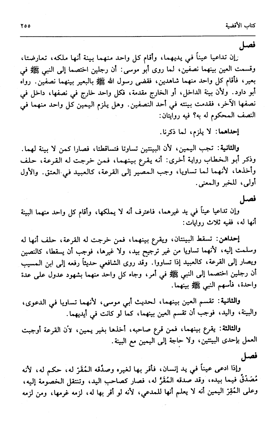 وإن تداعيا عيناً في يديهما، وأقام كل واحد منهما بينة أنها ملكه، تعارضتا، وقسمت العين بينهما نصفين، لما روى أبو موسى: «أن رجلين اختصما إلى النبي - صَلَّى اللَّهُ عَلَيْهِ وَسَلَّمَ - في بعير، فأقام كل واحد منهما شاهدين، فقضى رسول الله - صَلَّى اللَّهُ عَلَيْهِ وَسَلَّمَ - بالبعير بينهما نصفين» . رواه أبو داود؛ ولأن بينة الداخل أو الخارج مقدمة، فكل واحد خارج في نصفها، داخل في نصفها الآخر، فقدمت بينته في أحد النصفين. وهل يلزم اليمين كل واحد منهما في النصف المحكوم له به؟ فيه روايتان: