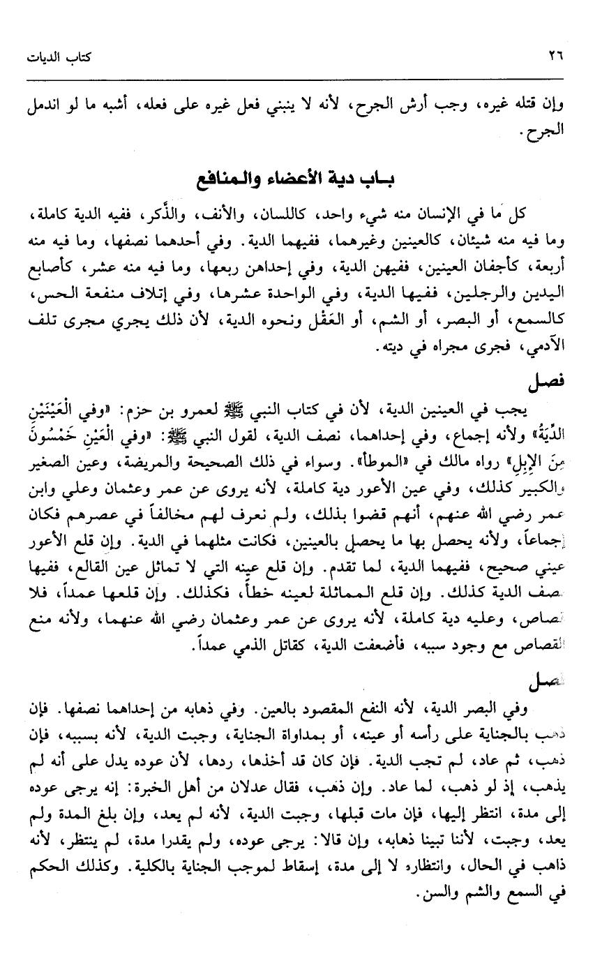 يجب في العينين الدية؛ لأن في كتاب النبي - صَلَّى اللَّهُ عَلَيْهِ وَسَلَّمَ - لعمر بن حزم: «وفي العينين الدية» ولأنه إجماع، وفي إحداهما نصف الدية؛ لقول النبي - صَلَّى اللَّهُ عَلَيْهِ وَسَلَّمَ -: «وفي العين خمسون من الإبل» رواه مالك في الموطأ. وسواء في ذلك الصحيحة والمريضة، وعين الصغير والكبير كذلك، وفي عين الأعور دية كاملة؛ لأنه يروى عن عمر، وعثمان، وعلي، وابن عمر - رَضِيَ اللَّهُ عَنْهُمْ -: أنهم قضوا بذلك، ولم نعرف لهم مخالفًا في عصرهم؛ فكان إجماعًا، ولأنه يحصل بها ما يحصل بالعينين، فكانت مثلهما في الدية، وإن قلع الأعور عيني صحيح، ففيها الدية، لما تقدم، وإن قلع عينه التي لا تماثل عين القالع، ففيها نصف الدية كذلك. وإن قلع المماثلة لعينه خطأ فكذلك، وإن قلعها عمدًا، فلا قصاص، وعليه دية كاملة؛ لأنه يروى عن عمر وعثمان - رَضِيَ اللَّهُ عَنْهُمَا -، ولأنه منع القصاص مع وجود سببه، فأضعفت الدية، كقاتل الذمي عمدًا.