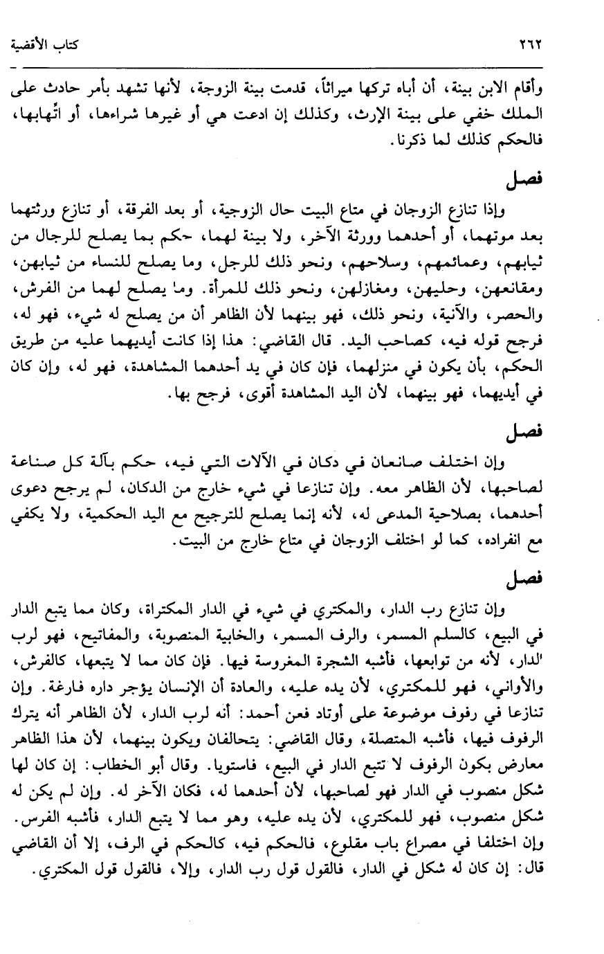 وإذا تنازع الزوجان في متاع البيت حال الزوجية، أو بعد الفرقة، أو تنازع ورثتهما بعد موتهما، أو أحدهما وورثة الآخر، ولا بينة لهما، حكم بما يصلح للرجال من ثيابهم، وعمائمهم، وسلاحهم، ونحو ذلك للرجل، وما يصلح للنساء من ثيابهن، ومقانعهن، وحليهن، ومغازلهن، ونحو ذلك للمرأة، وما يصلح لهما من الفرش، والحصر، والآنية، ونحو ذلك، فهو بينهما؛ لأن الظاهر أن من يصلح له شيء، فهو له، فرجح قوله فيه، كصاحب اليد.