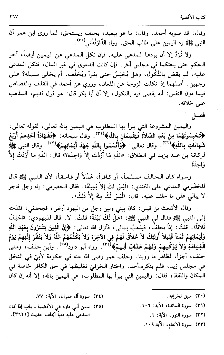 «وقال الأشعث بن قيس: كان بيني وبين رجل من اليهود أرض، فجحدني فقدمته إلى النبى - صَلَّى اللَّهُ عَلَيْهِ وَسَلَّمَ - فقال لي النبي - صَلَّى اللَّهُ عَلَيْهِ وَسَلَّمَ -: هل لك بينة؟ قلت لا، قال لليهودي: احلف ثلاثاً، قلت: إذاً يحلف، فيذهب بمالي، فأنزل الله تعالى: {إِنَّ الَّذِينَ يَشْتَرُونَ بِعَهْدِ اللَّهِ وَأَيْمَانِهِمْ ثَمَنًا قَلِيلا أُولَئِكَ لا خَلاقَ لَهُمْ فِي الآخِرَةِ وَلا يُكَلِّمُهُمُ اللَّهُ وَلا يَنْظُرُ إِلَيْهِمْ يَوْمَ الْقِيَامَةِ وَلا يُزَكِّيهِمْ وَلَهُمْ عَذَابٌ أَلِيمٌ} [آل عمران: 77] » رواه أبو داود وأين حلف، ومتى حلف، أجزأ، لظاهر ما روينا، وحلف عمر - رَضِيَ اللَّهُ عَنْهُ - في حكومة لأبي في النخل في مجلس زيد، فلم ينكره أحد.