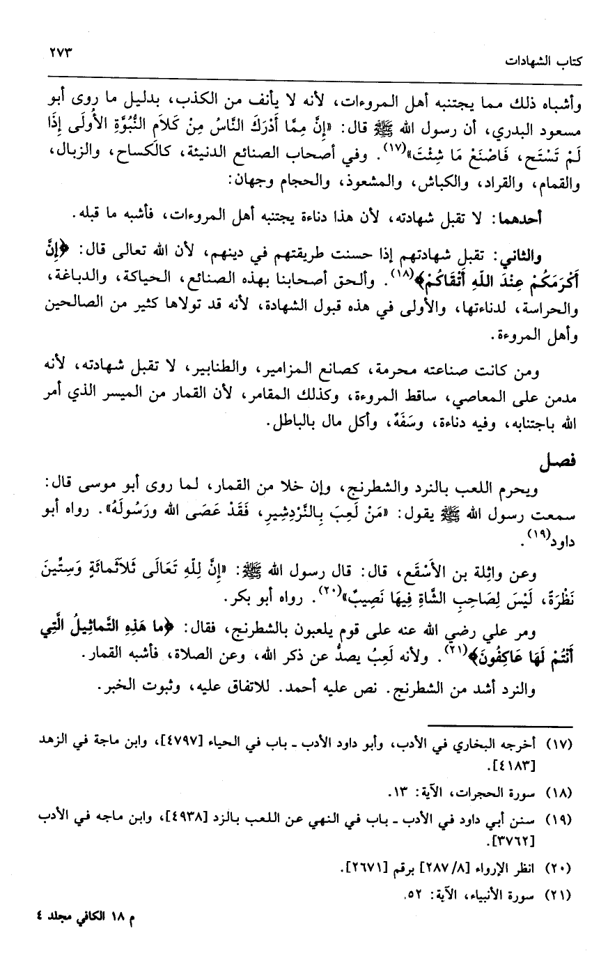 وأشباه ذلك مما يجتنبه أهل المروءات؛ لأنه لا يأنف من الكذب، بدليل ما روى أبو مسعود البدري، أن رسول الله - صَلَّى اللَّهُ عَلَيْهِ وَسَلَّمَ - قال: «إن مما أدرك الناس من كلام النبوة الأولى إذا لم تستح، فاصنع ما شئت» ، وفي أصحاب الصنائع الدنيئة، كالكساح، والزبال، والقمام، والقراد، والكباش، والمشعوذ، والحجام وجهان: أحدهما: لا تقبل شهادته؛ لأن هذا دناءة يجتنبه أهل المروءات، فأشبه ما قبله.