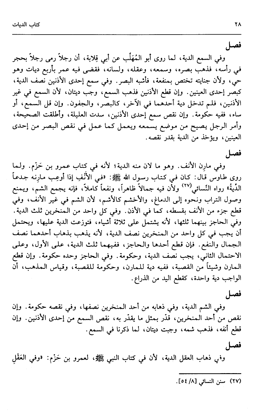 وفي مارن الأنف، وهو ما لان منه الدية؛ لأنه في كتاب عمرو بن حزم، ولما روى طاوس قال: كان في كتاب رسول الله - صَلَّى اللَّهُ عَلَيْهِ وَسَلَّمَ -: «في الأنف إذا أوعب مارنه جدعًا الدية» رواه النسائي. ولأن فيه جمالًا ظاهرًا، ونفعًا كاملًا، فإنه يجمع الشم، ويمنع وصول التراب ونحوه إلى الدماغ، والأخشم كالأشم؛ لأن الشم في غير الأنف، وفي قطع جزء من الأنف بقسطه، كما في الأذن. وفي كل واحد من المنخرين ثلث الدية، وفي الحاجز بينهما ثلثها؛ لأنه يشتمل على ثلاثة أشياء، فتوزعت الدية عليها، ويحتمل أن يجب في كل واحد من المنخرين نصف الدية؛ لأنه يذهب بذهاب أحدهما نصف الجمال والنفع، فإن قطع أحدها والحاجز، ففيهما ثلث الدية، على الأول، وعلى الاحتمال الثاني، يجب نصف الدية، وحكومة. وفي الحاجز وحده حكومة. وإن قطع المارن وشيئًا من القصبة، ففيه دية للمارن، وحكومة للقصبة، وقياس المذهب: أن الواجب دية واحدة، كقطع اليد من الذراع.