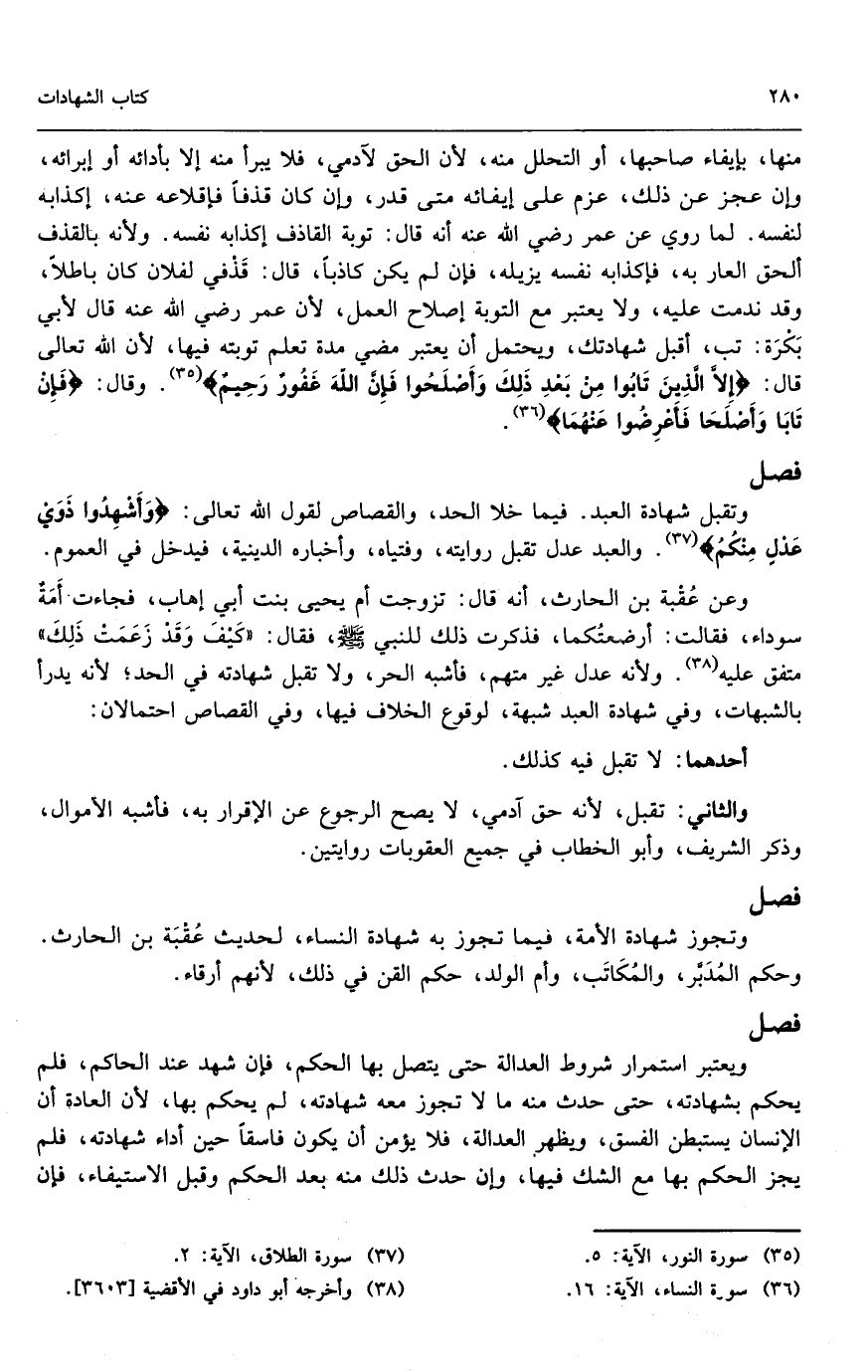 منها، بإيفاء صاحبها، أو التحلل منه؛ لأن الحق لأدمي، فلا يبرأ منه إلا بأدائه أو إبرائه، وإن عجز عن ذلك، عزم على إيفائه متى قدر، وإن كان قذفاً فإقلاعه عنه، إكذابه لنفسه؛ لما روي عن عمر - رَضِيَ اللَّهُ عَنْهُ - أنه قال: توبة القاذف إكذابه نفسه، ولأنه بالقذف ألحق العار به، فإكذابه نفسه يزيله، فإن لم يكن كاذباً، قال: قذفي لفلان كان باطلاً، وقد ندمت عليه، ولا يعتبر مع التوبة إصلاح العمل؛ لأن عمر - رَضِيَ اللَّهُ عَنْهُ - قال لأبي بكرة: تب، أقبل شهادتك، ويحتمل أن يعتبر مضي مدة تعلم توبته فيها؛ لأن الله تعالى قال: {إِلا الَّذِينَ تَابُوا مِنْ بَعْدِ ذَلِكَ وَأَصْلَحُوا فَإِنَّ اللَّهَ غَفُورٌ رَحِيمٌ} [النور: 5] ، وقال: {فَإِنْ تَابَا وَأَصْلَحَا فَأَعْرِضُوا عَنْهُمَا} [النساء: 16] .