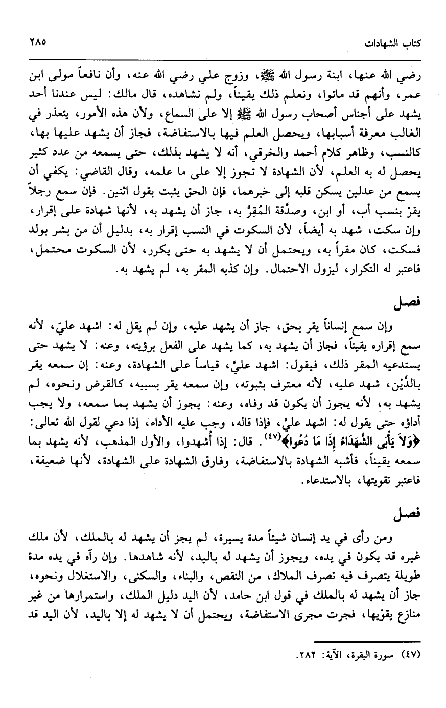 - رَضِيَ اللَّهُ عَنْهَا -، ابنة رسول الله - صَلَّى اللَّهُ عَلَيْهِ وَسَلَّمَ -، وزوج علي - رَضِيَ اللَّهُ عَنْهُ -، وأن نافعاً مولى ابن عمر، وأنهم قد ماتوا، ونعلم ذلك يقيناً، ولم نشاهده، قال مالك: ليس عندنا أحد يشهد على أجناس أصحاب رسول الله - صَلَّى اللَّهُ عَلَيْهِ وَسَلَّمَ - إلا على السماع، ولأن هذه الأمور، يتعذر في الغالب معرفة أسبابها، ويحصل العلم فيها بالاستفاضة، فجاز أن يشهد عليها بها، كالنسب، وظاهر كلام أحمد والخرقي، أنه لا يشهد بذلك، حتى يسمعه من عدد كثير يحصل له به العلم؛ لأن الشهادة لا تجوز إلا على ما علمه، وقال القاضي: يكفي أن يسمع من عدلين يسكن قلبه إلى خبرهما، فإن الحق يثبت بقول اثنين، فإن سمع رجلاً يقر بنسب أب، أو ابن، وصدقة المقر به، جاز أن يشهد به؛ لأنها شهادة على إقرار، وإن سكت، شهد به أيضاً؛ لأن السكوت في النسب إقرار به، بدليل أن من بشر بولد فسكت، كان مقراً به، ويحتمل أن لا يشهد به حتى يكرر؛ لأن السكوت محتمل، فاعتبر له التكرار، ليزول الاحتمال، وإن كذبه المقر به، لم يشهد به.