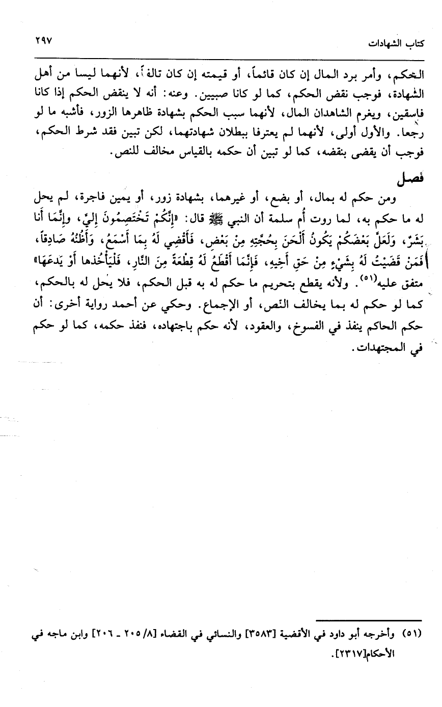 ومن حكم له بمال، أو بضع، أو غيرهما بشهادة زور أو يمين فاجرة، لم يحل له ما حكم به، لما روت أم سلمة أن النبي - صَلَّى اللَّهُ عَلَيْهِ وَسَلَّمَ - قال: «إنكم تختصمون إلي وإنما أنا بشر، ولعل بعضكم يكون ألحن بحجته من بعض، فأقضي له بما أسمع، وأظنه صادقاً، فمن قضيت له، بشيء من حق أخيه، فإنما أقطع له قطعة من النار فليأخذها أو يدعها» متفق عليه، ولأنه يقطع بتحريم ما حكم له به قبل الحكم، فلا يحل له بالحكم كما لو حكم له بما يخالف النص، أو الإجماع، وحكي عن أحمد رواية أخرى: أن حكم الحاكم ينفذ في الفسوخ، والعقود؛ لأنه حكم باجتهاده، فنفذ حكمه، كما لو حكم في المجتهدات.