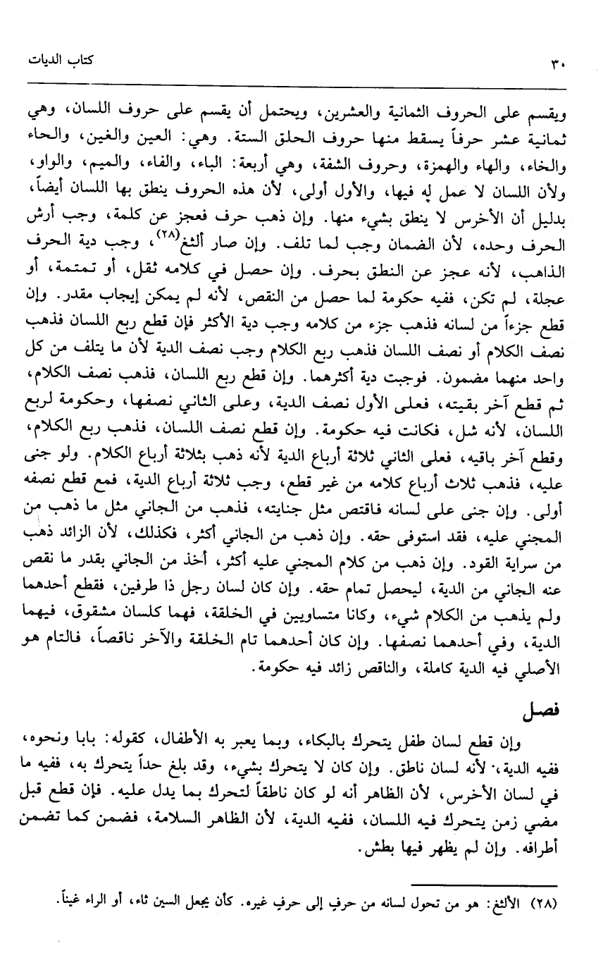 ويقسم على الحروف الثمانية والعشرين، ويحتمل أن يقسم على حروف اللسان، وهي ثمانية عشر حرفًا، يسقط منها حروف الحلق الستة؛ وهي: العين والغين، والحاء والخاء، والهاء والهمزة، وحروف الشفة وهي أربعة: الباء، والفاء، والميم، والواو، ولأن اللسان لا عمل له فيها، والأول أولى؛ لأن هذه الحروف ينطق بها اللسان أيضًا، بدليل أن الأخرس لا ينطق بشيء منها، وإن ذهب حرف فعجز عن كلمة، وجب أرش الحرف وحده؛ لأن الضمان وجب لما تلف، وإن صار ألثغ وجب دية الحرف الذاهب؛ لأنه عجز عن النطق بحرف، وإن حصل في كلامه ثقل، أو تمتمة، أو عجلة، لم تكن، ففيه حكومة لما حصل من النقص؛ لأنه لم يمكن إيجاب مقدر. وإن قطع جزءًا من لسانه فذهب جزء من كلامه وجب دية الأكثر، فإن قطع ربع اللسان فذهب نصف الكلام، أو نصف اللسان فذهب ربع الكلام وجب نصف الدية؛ لأن ما يتلف من كل واحد منهما مضمون، فوجبت دية أكثرهما، وإن قطع ربع اللسان، فذهب نصف الكلام، ثم قطع آخر بقيته، فعلى الأول نصف الدية، وعلى الثاني نصفها، وحكومة لربع اللسان؛ لأنه شل، فكانت فيه حكومة.