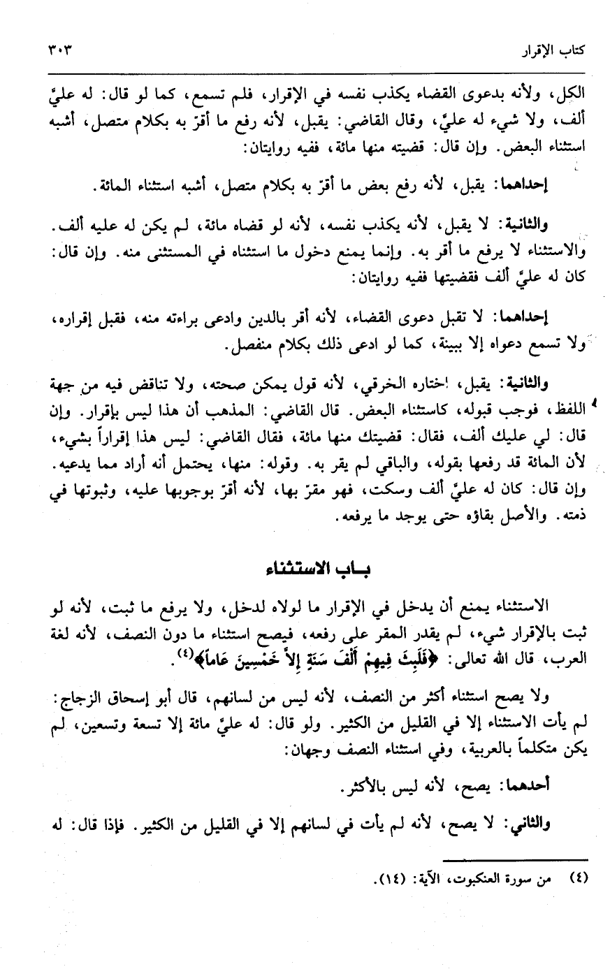 باب الاستثناء الاستثناء يمنع أن يدخل في الإقرار ما لولاه لدخل، ولا يرفع ما ثبت؛ لأنه لو ثبت بالإقرار شيء، لم يقدر المقر على رفعه، فيصح استثناء ما دون النصف؛ لأنه لغة العرب، قال الله تعالى: {فَلَبِثَ فِيهِمْ أَلْفَ سَنَةٍ إِلا خَمْسِينَ عَامًا} [العنكبوت: 14] ولا يصح استثناء أكثر من النصف، لأنه ليس من لسانهم، قال أبو إسحاق الزجاج: لم يأت الاستثناء إلا في القليل من الكثير.