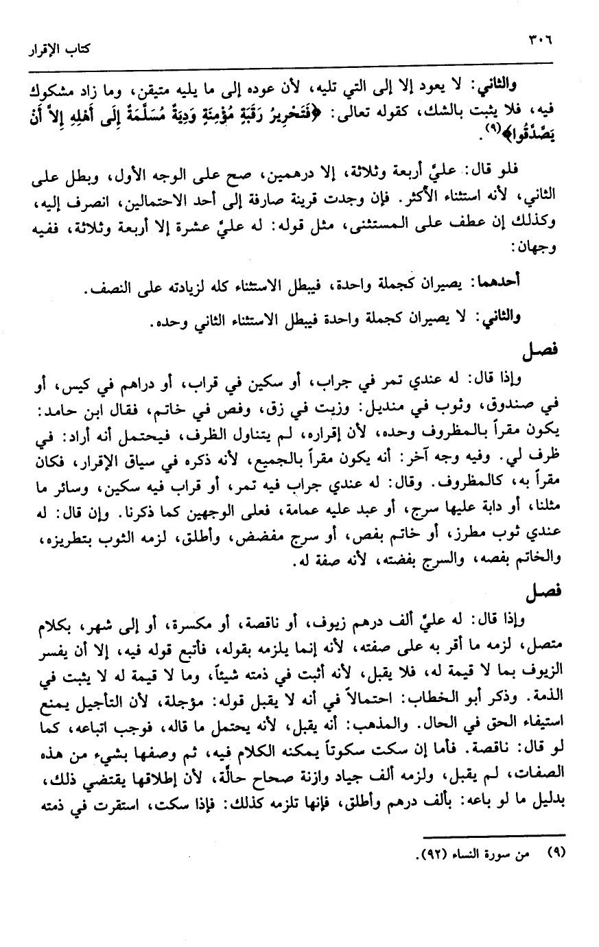 والثاني: لا يعود إلا إلى التي تليه؛ لأن عوده إلى ما يليه متيقن، وما زاد مشكوك فيه، فلا يثبت بالشك، كقوله تعالى: {فَتَحْرِيرُ رَقَبَةٍ مُؤْمِنَةٍ وَدِيَةٌ مُسَلَّمَةٌ إِلَى أَهْلِهِ إِلا أَنْ يَصَّدَّقُوا} [النساء: 92] .