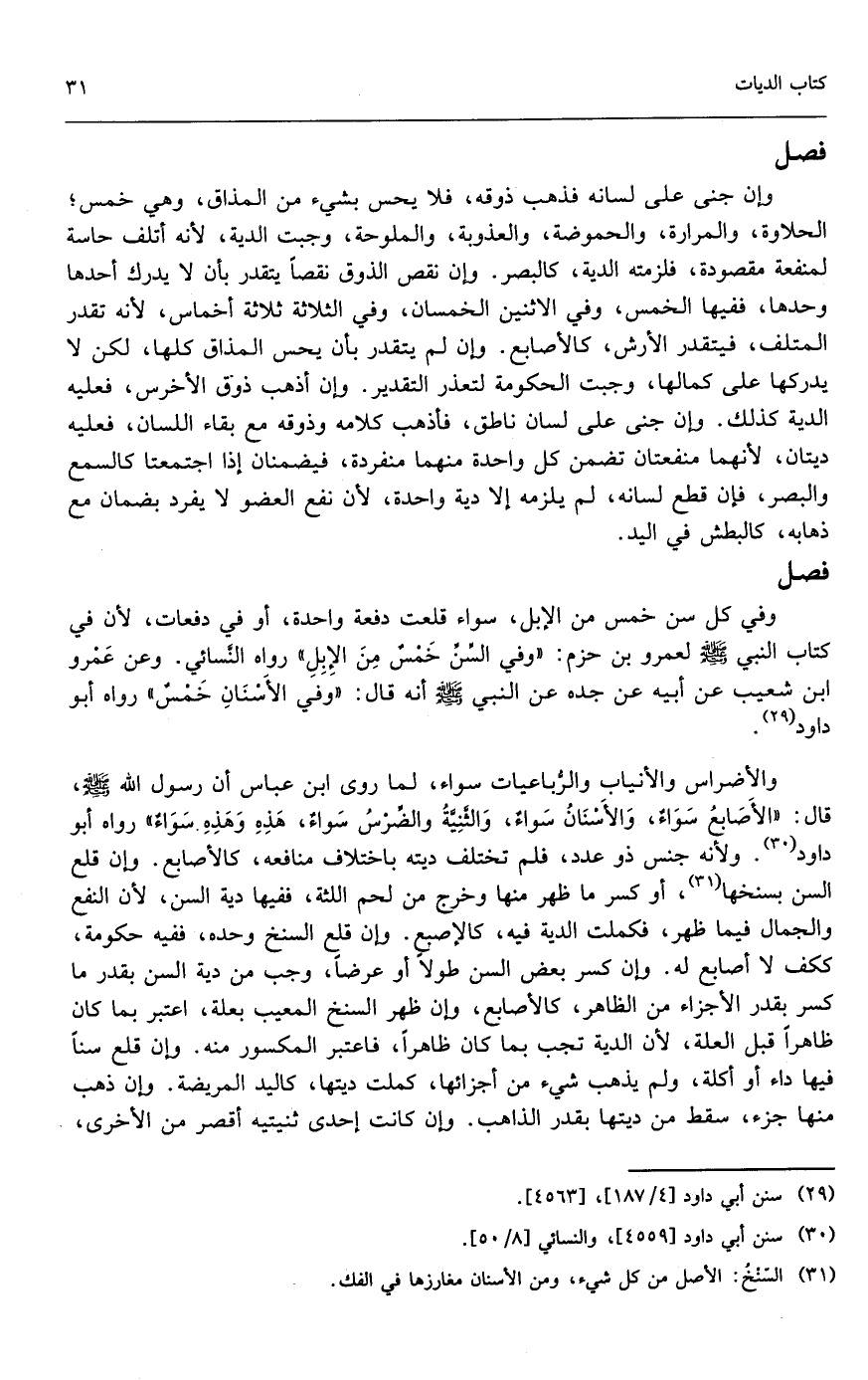 وفي كل سن خمس من الإبل، سواء قلعت دفعة واحدة أو في دفعات؛ لأن في كتاب النبي - صَلَّى اللَّهُ عَلَيْهِ وَسَلَّمَ -، لعمرو بن حزم: «وفي السن خمس من الإبل» رواه النسائي. وعن عمرو بن شعيب، عن أبيه، عن جده، عن النبي - صَلَّى اللَّهُ عَلَيْهِ وَسَلَّمَ - أنه قال: «وفي الأسنان خمس» رواه أبو داود.