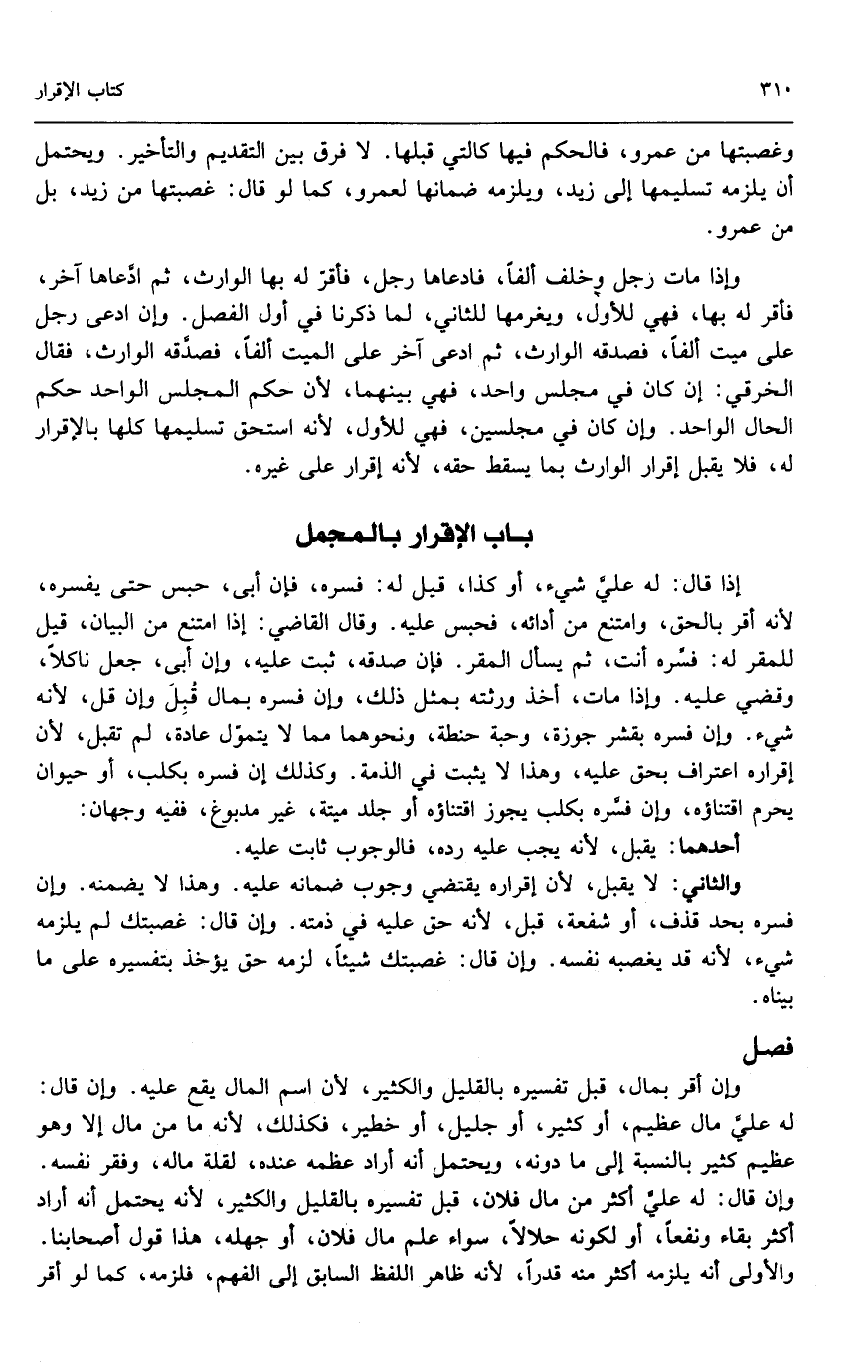 والثاني: لا يقبل؛ لأن إقراره يقتضي وجوب ضمانه عليه، وهذا لا يضمنه، وإن فسره بحد قذف، أو شفعة، قبل؛ لأنه حق عليه في ذمته، وإن قال: غصبتك لم يلزمه شيء؛ لأنه قد يغصبه نفسه، وإن قال: غصبتك شيئاً، لزمه حق يؤخذ بتفسيره على ما بيناه.