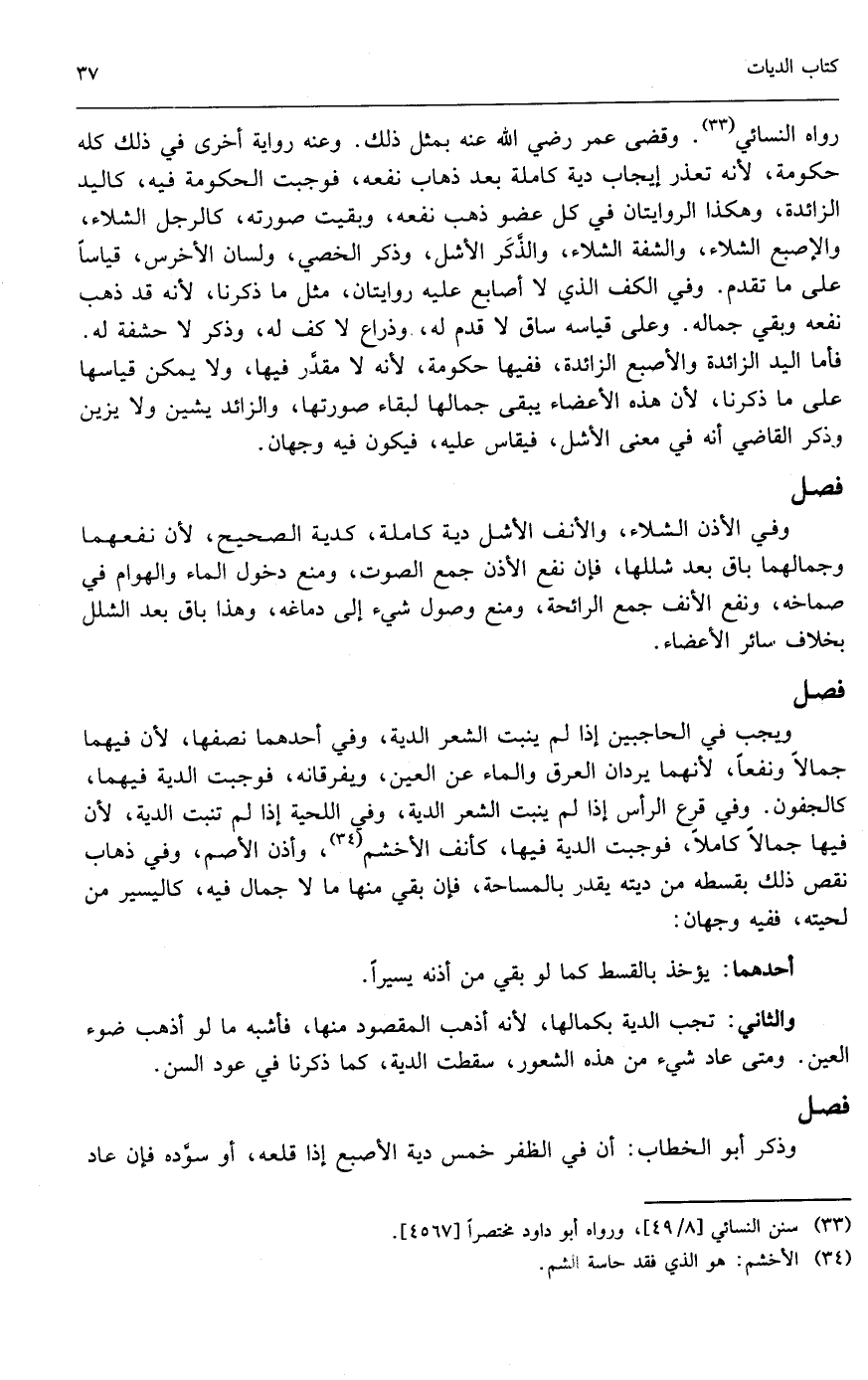 رواه النسائي. وقضى عمر - رَضِيَ اللَّهُ عَنْهُ - بمثل ذلك، وعنه رواية أخرى في ذلك كله حكومة؛ لأنه تعذر إيجاب دية كاملة بعد ذهاب نفعه، فوجبت الحكومة فيه، كاليد الزائدة، وهكذا الروايتان في كل عضو ذهب نفعه، وبقيت صورته، كالرجل الشلاء، والإصبع الشلاء، والشفة الشلاء، والذكر الأشل، وذكر الخصي، ولسان الأخرس، قياسًا على ما تقدم، وفي الكف الذي لا أصابع عليه روايتان، مثل ما ذكرنا؛ لأنه قد ذهب نفعه وبقي جماله، وعلى قياسه ساق لا قدم له، وذراع لا كف له، وذكر لا حشفة له. فأما اليد الزائدة والإصبع الزائدة، ففيها حكومة؛ لأنه لا مقدر فيها، ولا يمكن قياسها على ما ذكرنا؛ لأن هذه الأعضاء يبقى جمالها لبقاء صورتها، والزائد يشين ولا يزين، وذكر القاضي أنه في معنى الأشل، فيقاس عليه، فيكون فيه وجهان.