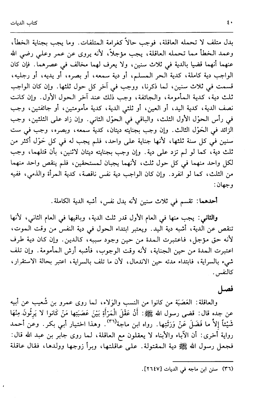 بدل متلف لا تحمله العاقلة، فوجب حالًا كغرامة المتلفات. وما يجب بجناية الخطأ، وعمد الخطأ مما تحمله العاقلة، يجب مؤجلًا؛ لأنه يروى عن عمر وعلي - رَضِيَ اللَّهُ عَنْهُمَا -: أنهما قضيا بالدية في ثلاث سنين، ولا يعرف لهما مخالف في عصرهما، فإن كان الواجب دية كاملة، كدية الحر المسلم، أو دية سمعه، أو بصره، أو يديه، أو رجليه، قسمت في ثلاث سنين، لما ذكرنا، ووجب في آخر كل حول ثلثها.